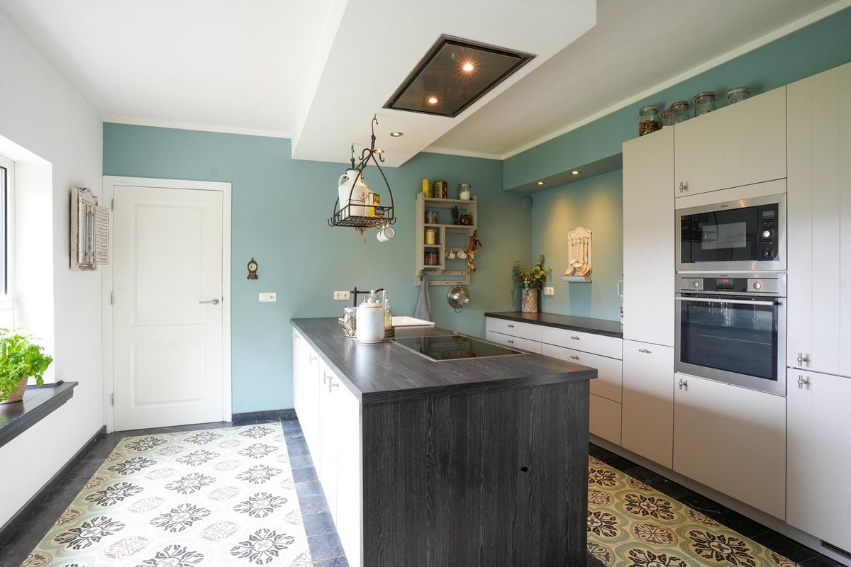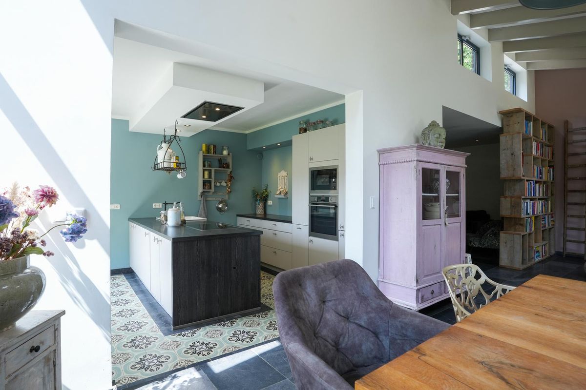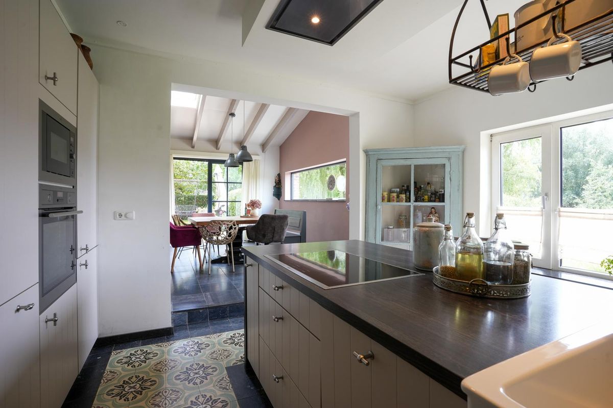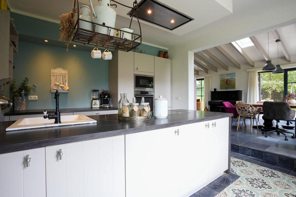 Semi open keuken voorzien van plavuizen, aanbouwinstallatie met kookeiland en de volgende apparatuur: inductiekookplaat, ingebouwde plafondafzuiging, combi magnetron, oven, vaatwasser en koelvriescombinatie