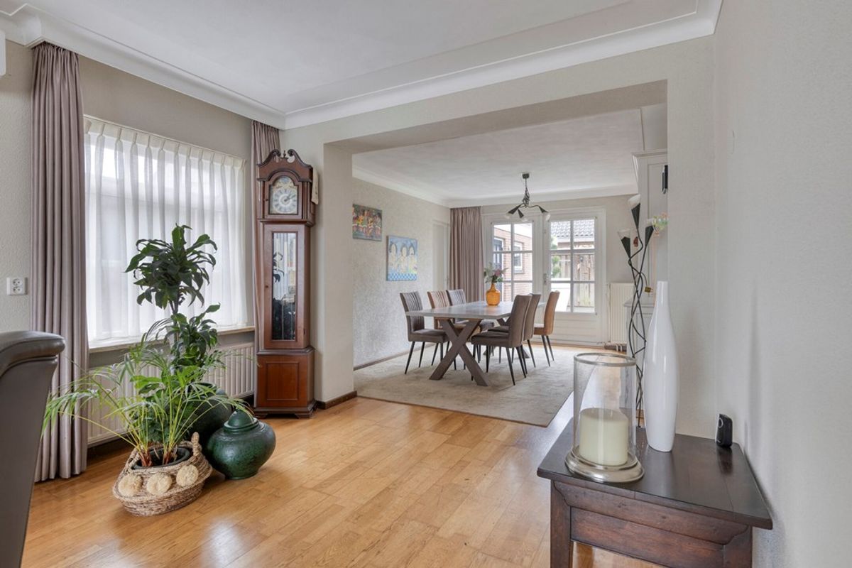 De L-vormige woonkamer is heerlijk licht dankzij de grote raampartijen en biedt volop indelingsmogelijkheden. De strak gestucte wanden en plafonds, gecombineerd met de fraaie parketvloer, geven een verzorgde en warme uitstraling. Via openslaande tuindeuren loopt de woonkamer naadloos over in de tuin. Aan de achterzijde bevindt zich een multifunctionele aanbouw, momenteel ingericht als ontspanningsruimte, maar ook ideaal als praktijkruimte, hobbykamer, speelkamer of extra bergruimte. De ruimte is netjes afgewerkt met laminaatvloer en gestucte wanden.