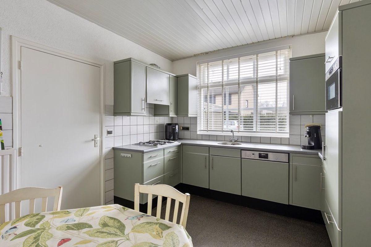 De royale woonkeuken vormt het hart van de woning. Uitgevoerd in een lichte U-opstelling, is deze keuken volledig uitgerust met inbouwapparatuur zoals koelkast, gaskookstel, combi-oven/magnetron, afzuigkap, vaatwasser en een enkele spoelbak. Het grote raam boven het aanrecht zorgt voor veel natuurlijk licht en een prettig uitzicht op de straat. De carrouselkast biedt extra opbergruimte en er is volop ruimte voor een gezellige eethoek.
