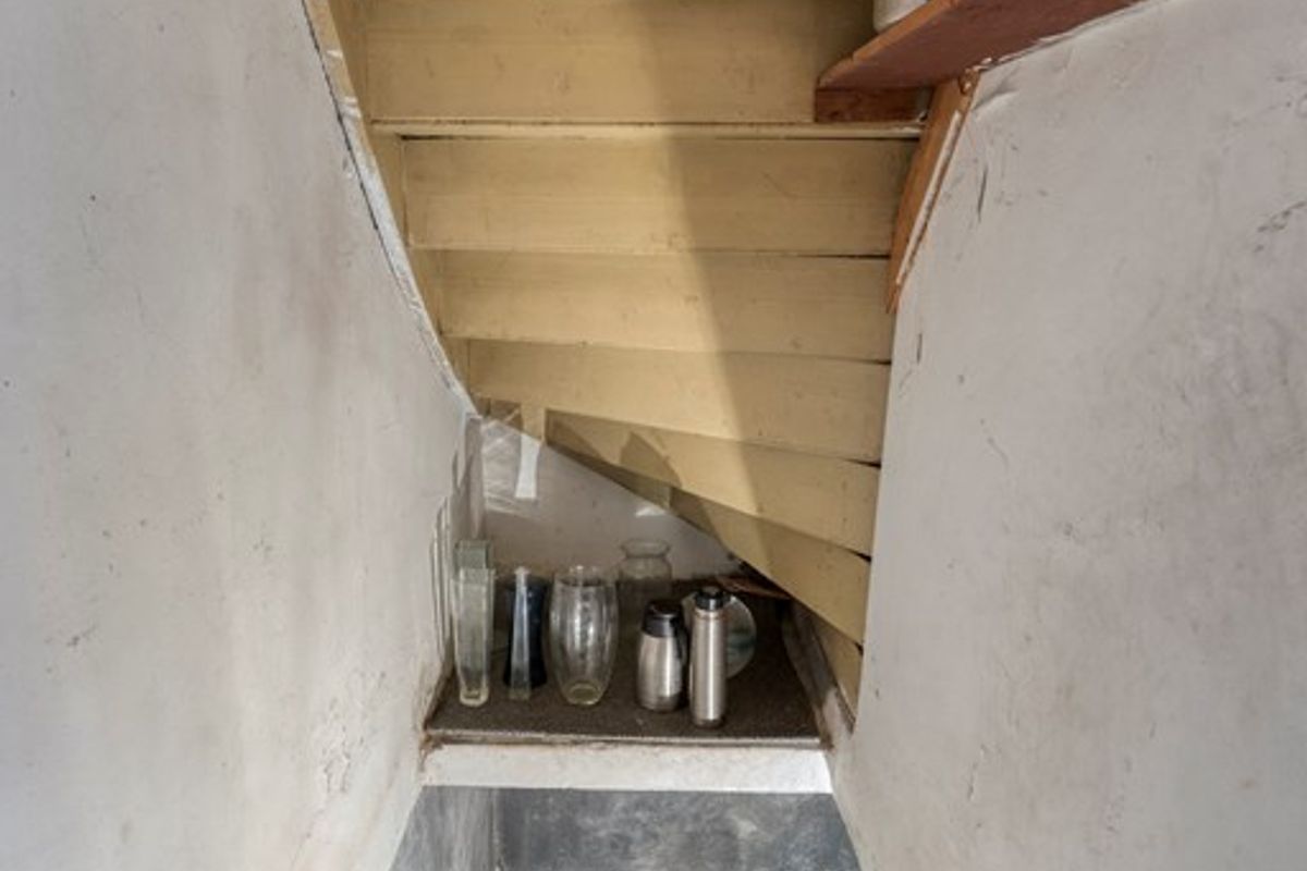 Vanuit de keuken bereikt u de woonkamer, de bijkeuken en de kelder, die extra opslag- en provisieruimte biedt.
