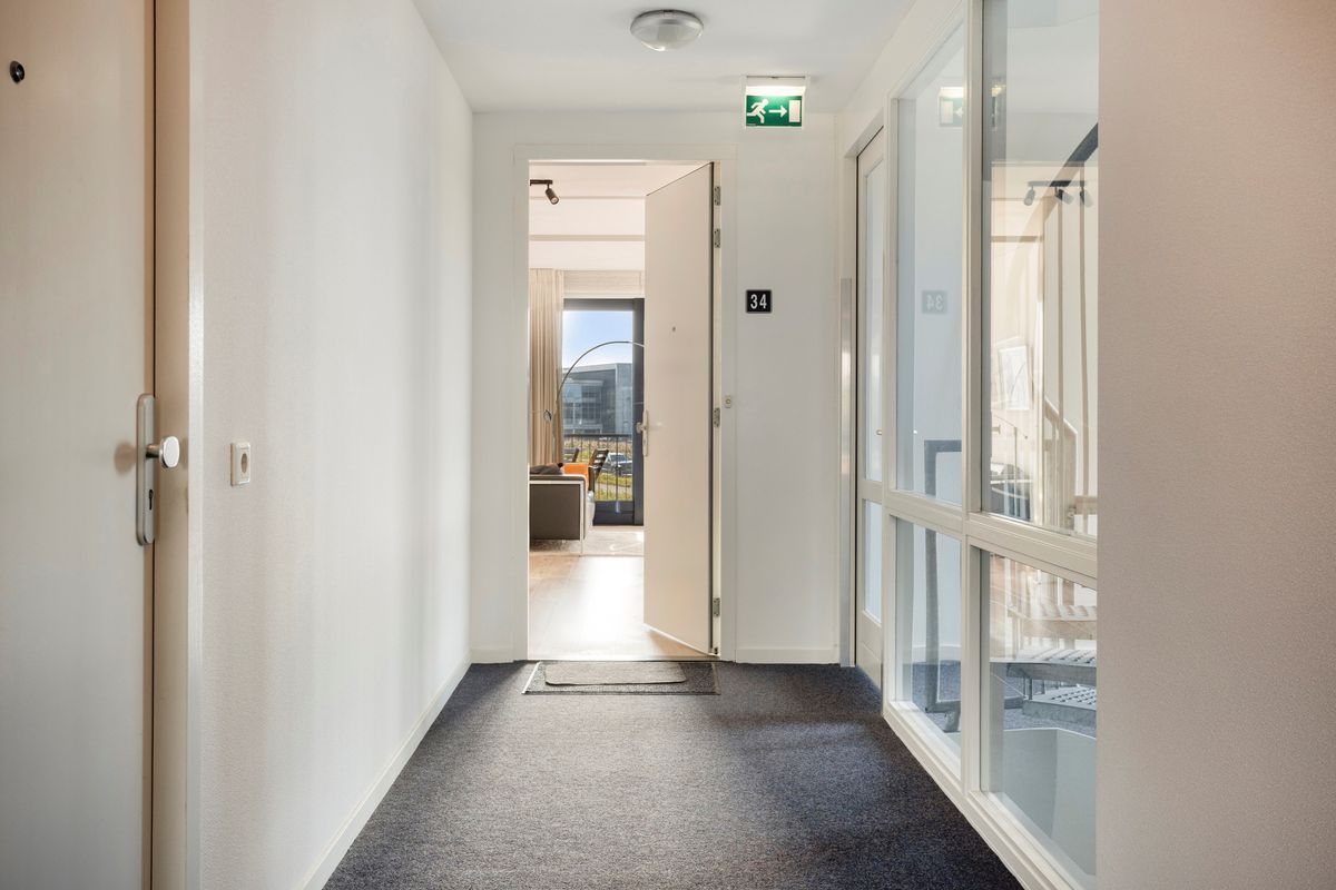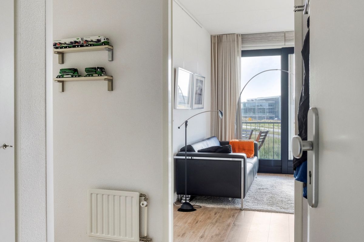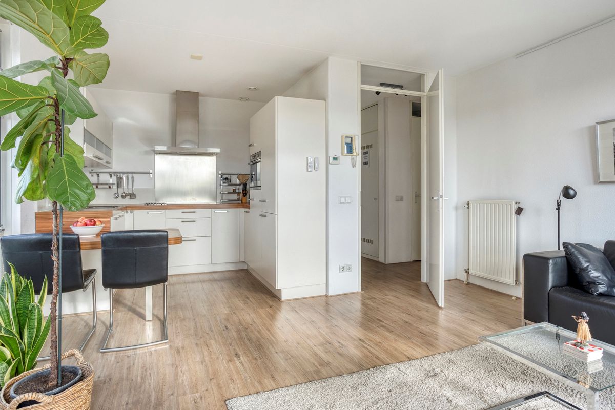Entree met toegang tot de hal. In de hal toegang tot de toiletruimte, toiletruimte v.v. hangend toilet en fontein, technische ruimte met wasmachine-aansluiting en HR CV ketelopstelling (Intergas 2011), badkamer met inloopdouche en meubel. Grote ouderslaapkamer op de hoekzijde met veel lichtinval en v.v. rolluiken en airconditioning, kleinere slaapkamer met voldoende ruimte voor 1-persoons bed. Dankzij de hoekligging van het appartement geniet je in de woonkamer, met de open keukenruimte, van veel lichtinval. Deze lichtinval kan worden getemperd met de aanwezige screens. De keukenruimte is v.v. een keuken in U-opstelling en beschikt over o.a. vaatwasser, koel vries-combinatie, combi-oven/magnetron, inductie kookplaat met rvs achterwand, afzuigunit en is verder uitgerust met een leuke lunch bar. Vanuit de woonkamer is er door de schuifpui toegang tot het ruime balkon (ca. 8 m2) en biedt de bewoner(s) prachtige vergezichten. De woonkamer met open keukenruimte is v.v. airconditioning, de intercom in de woonkamer legt de verbinding naar het bel plateau.
