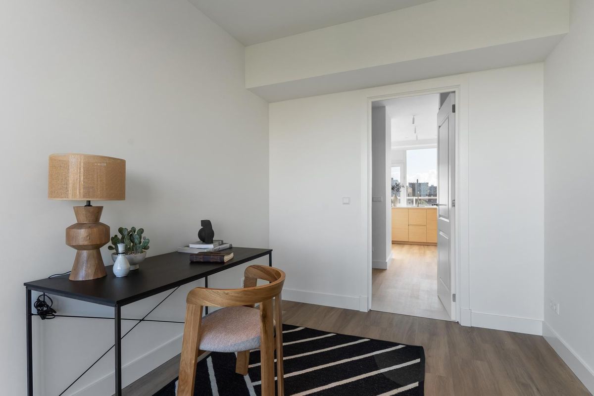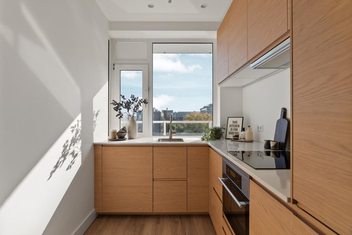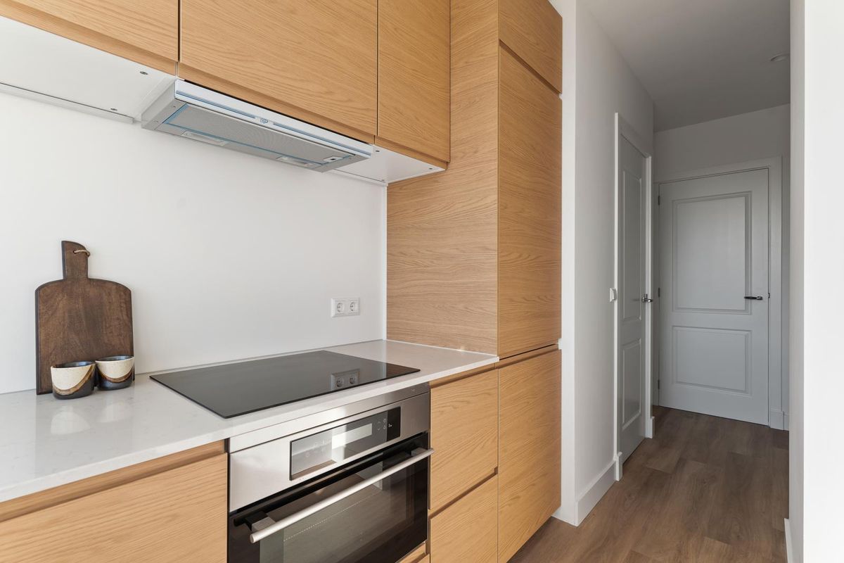 Aan de voorzijde ligt de splinternieuwe keuken, voorzien van alle inbouwapparatuur: combi-oven, vaatwasser, inductiekookplaat, koelkast en vriezer. Naast de keuken bevindt zich een slaapkamer van ca. 12 m².