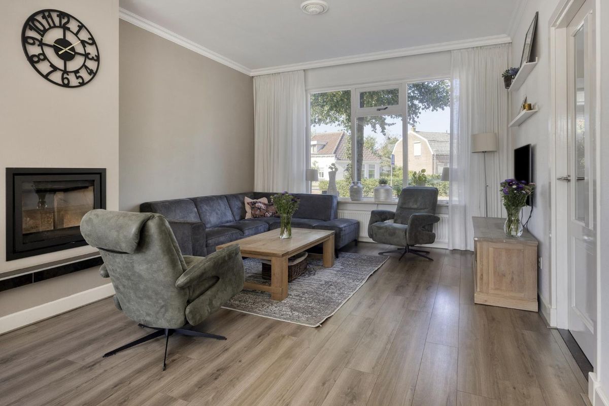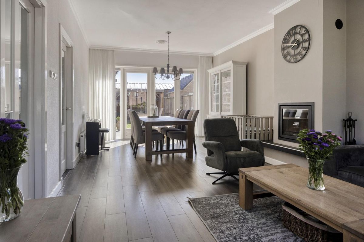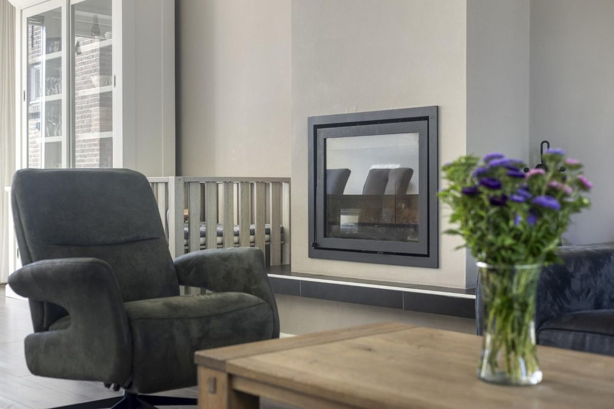 De woonkamer is licht en sfeervol, met een open haard die voor extra warmte en gezelligheid zorgt.
