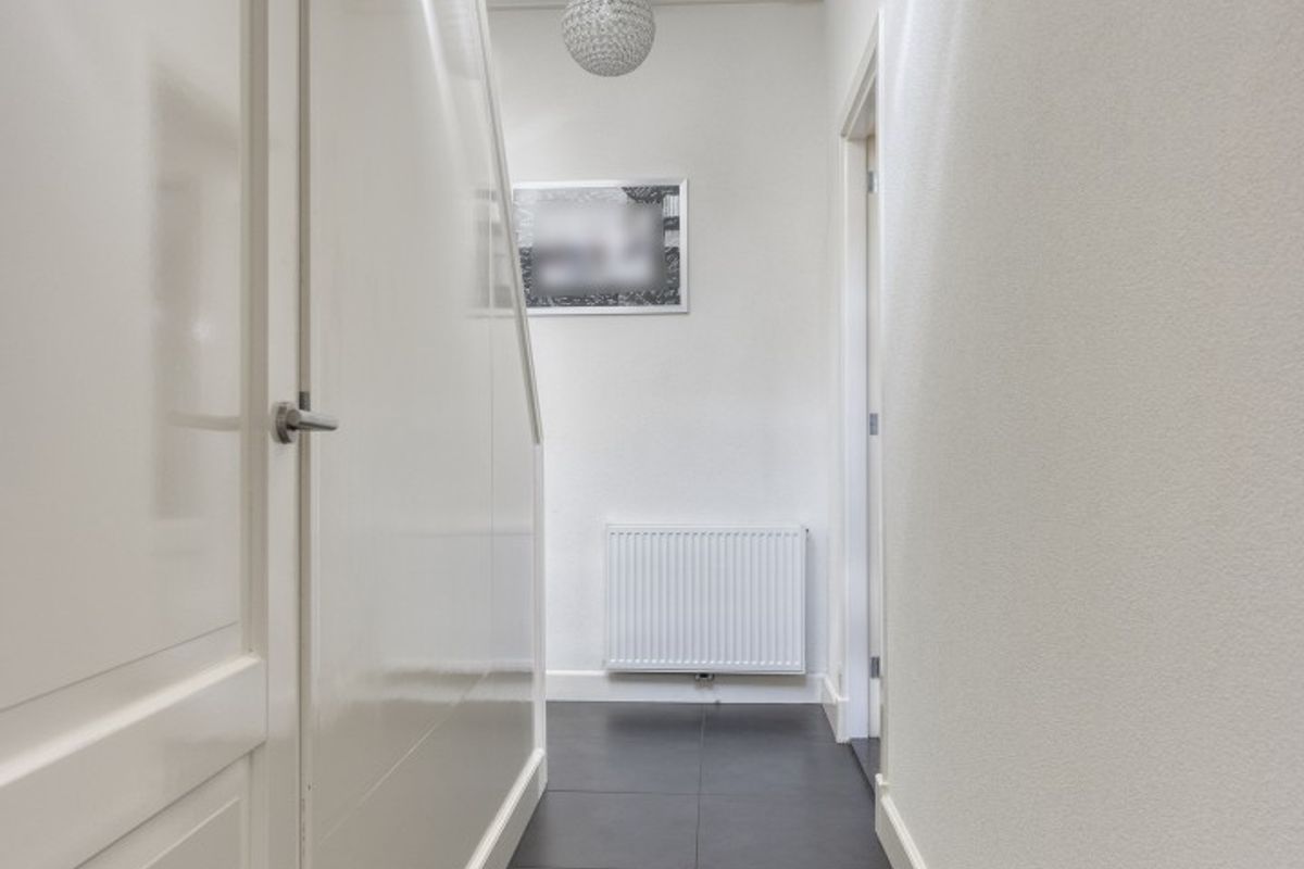 Loop je verder naar het achterhuis, dan kom je via de hal – die ook toegang biedt tot de tuin – in de bijkeuken met aansluitingen voor de wasmachine en droger en een handige uitstortgootsteen.