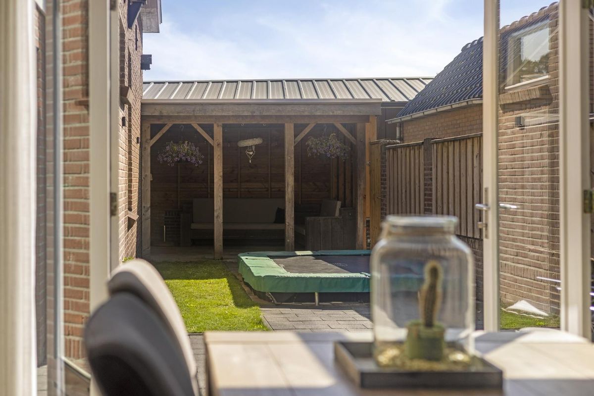 Er is een overkapping aanwezig waar je met gemak een lounge- of eethoek kunt plaatsen.