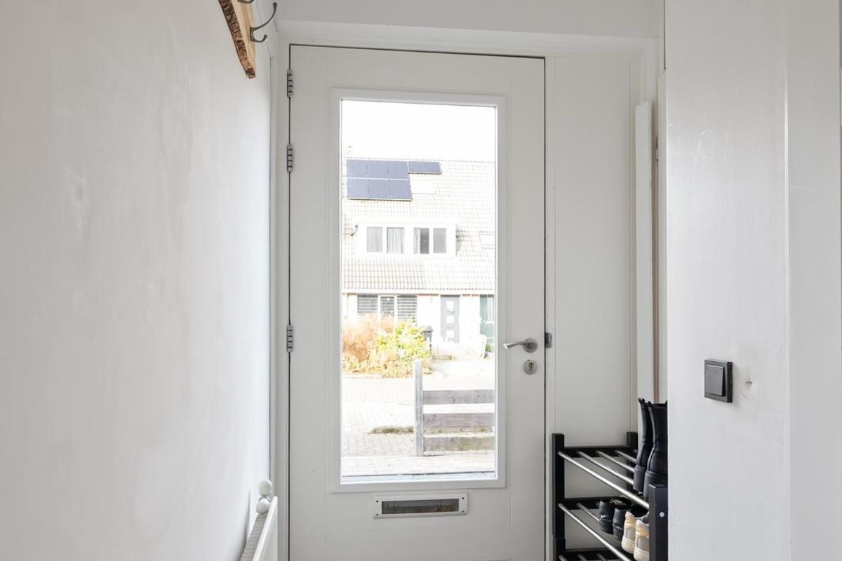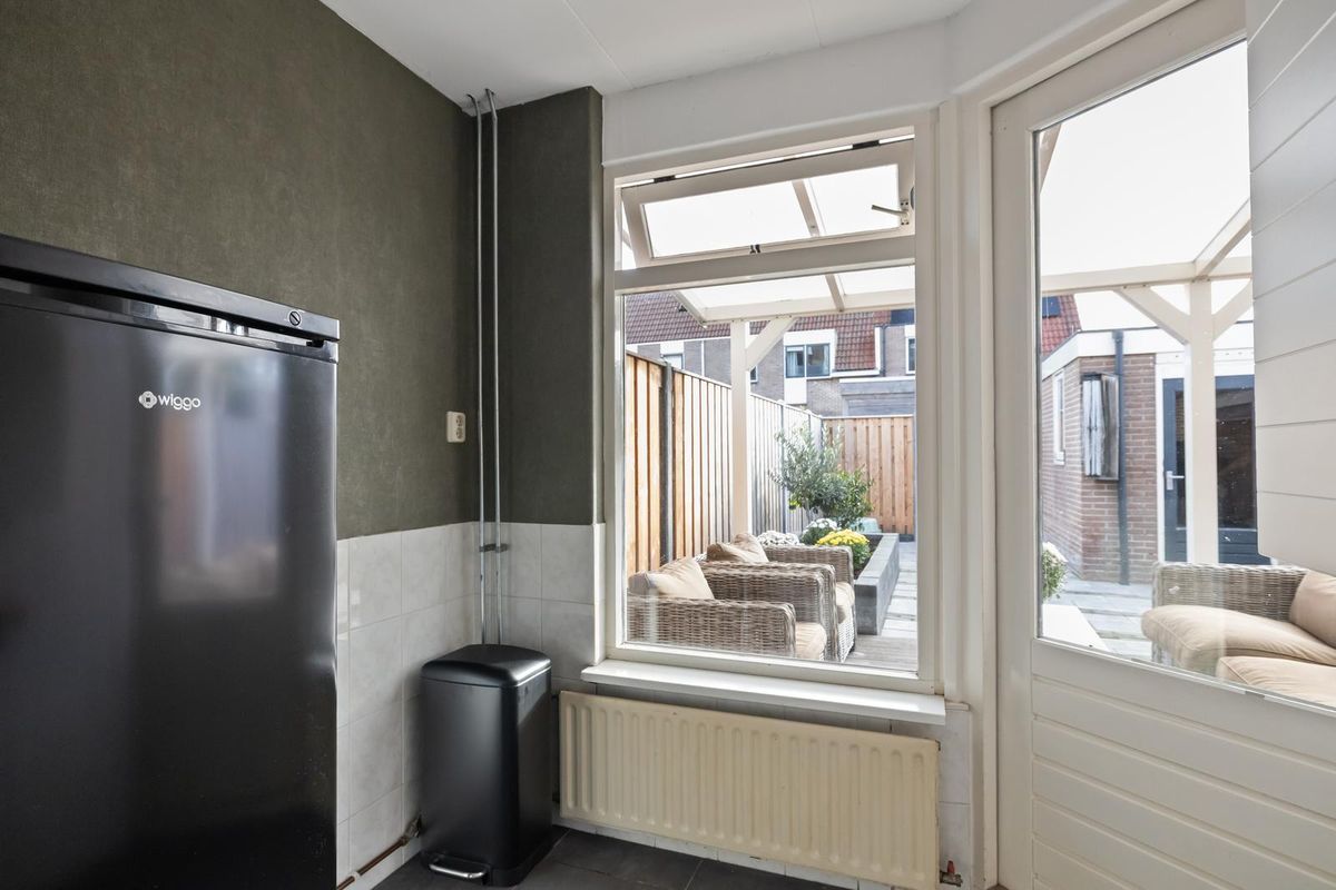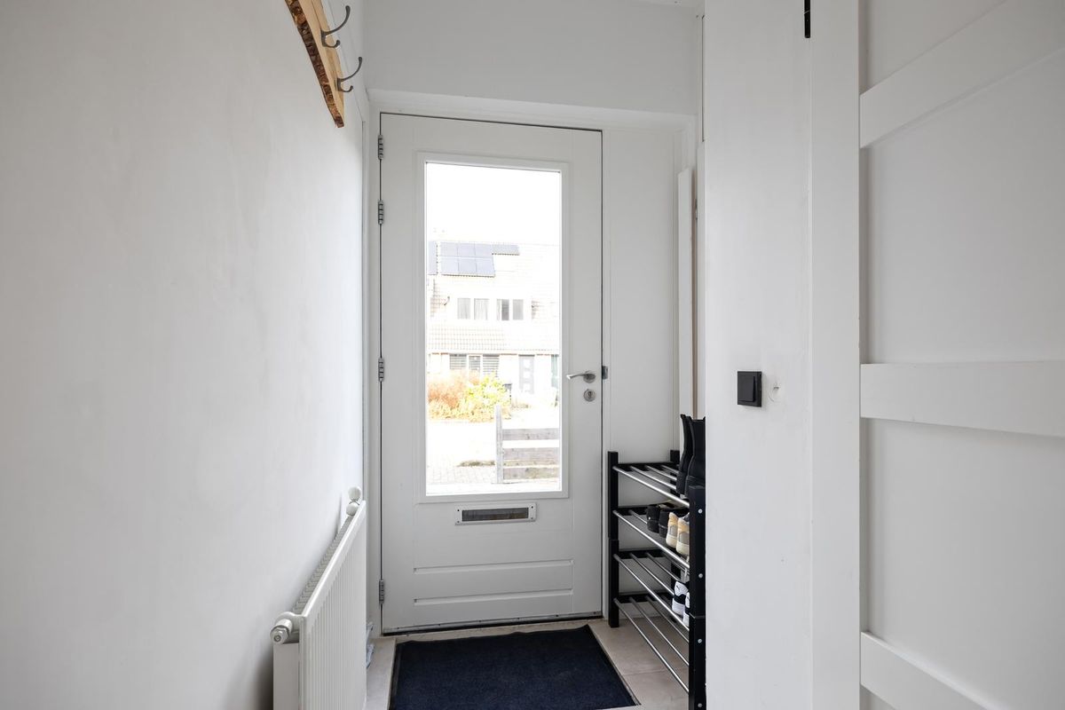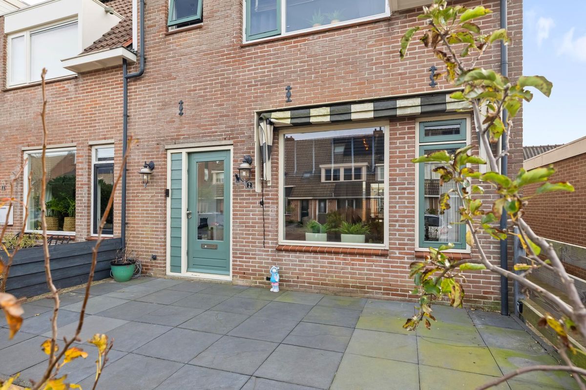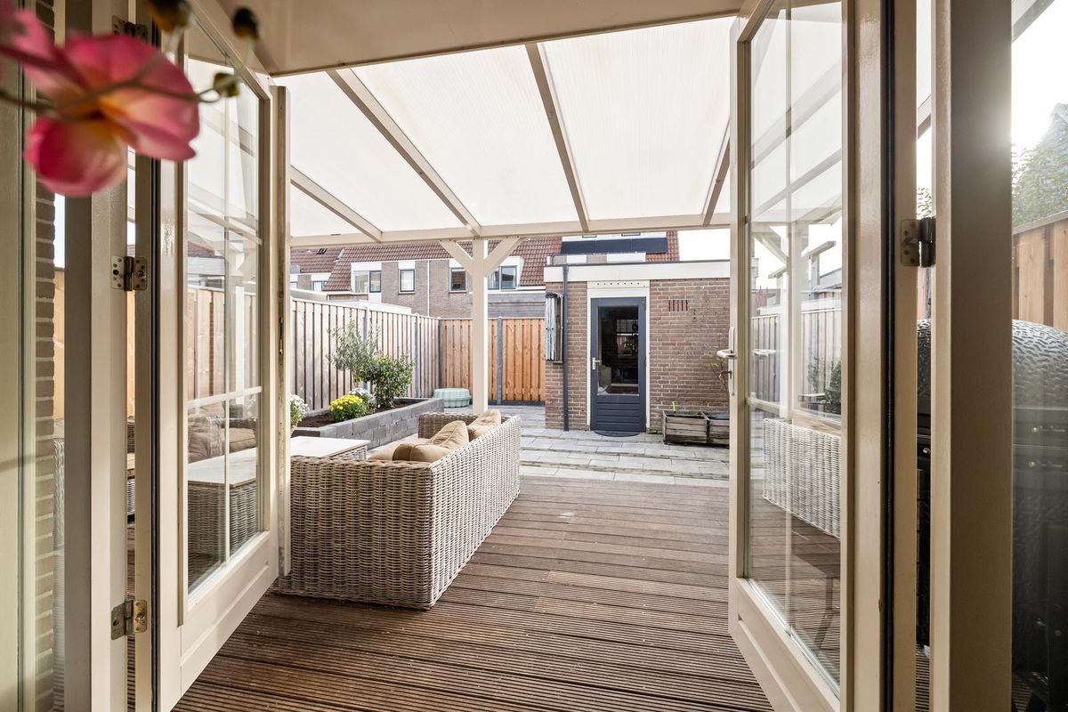 Aan de achterzijde van de woning bevindt zich een fijne veranda met vlonderterras, een heerlijke plek om beschut te zitten en van de zon te genieten. De tuin is onderhoudsvriendelijk aangelegd en beschikt over een stenen berging en een achterom. De ligging aan de kop van het rijtje zorgt voor extra privacy en lichtinval.