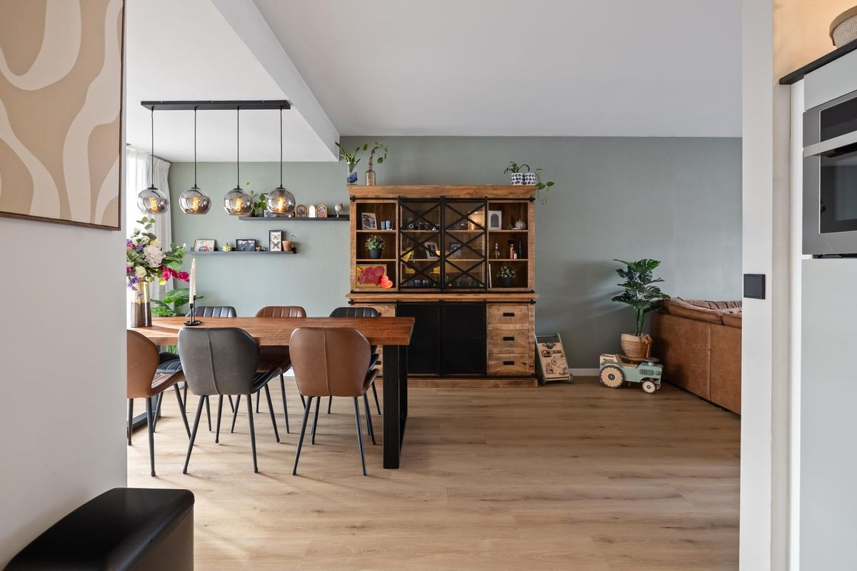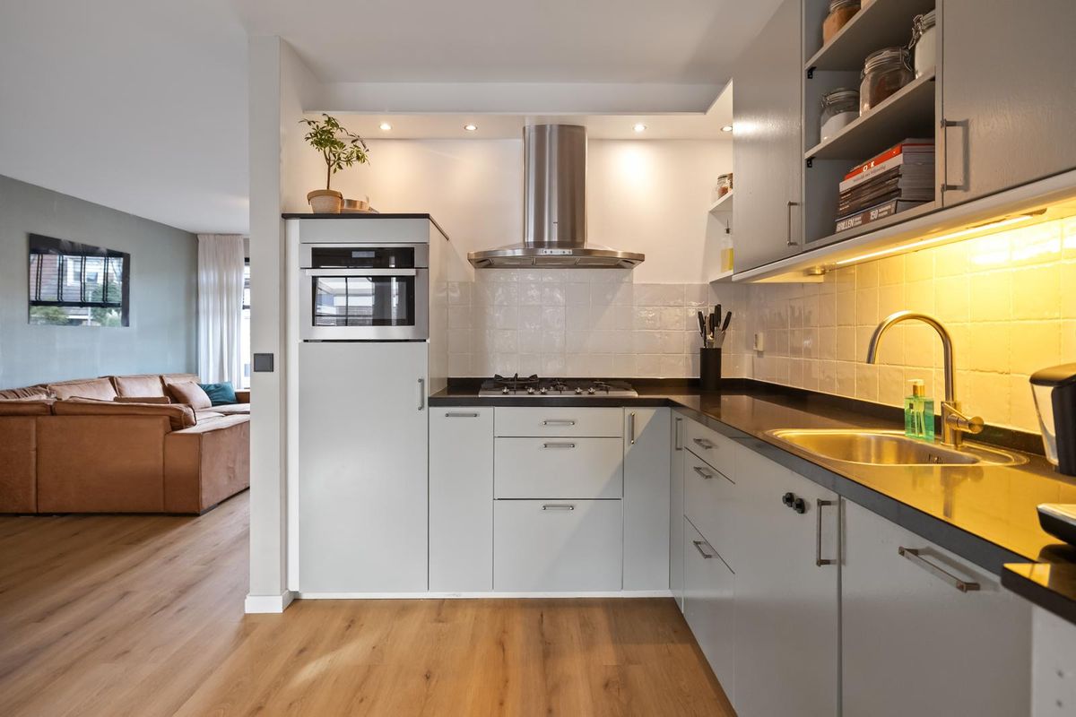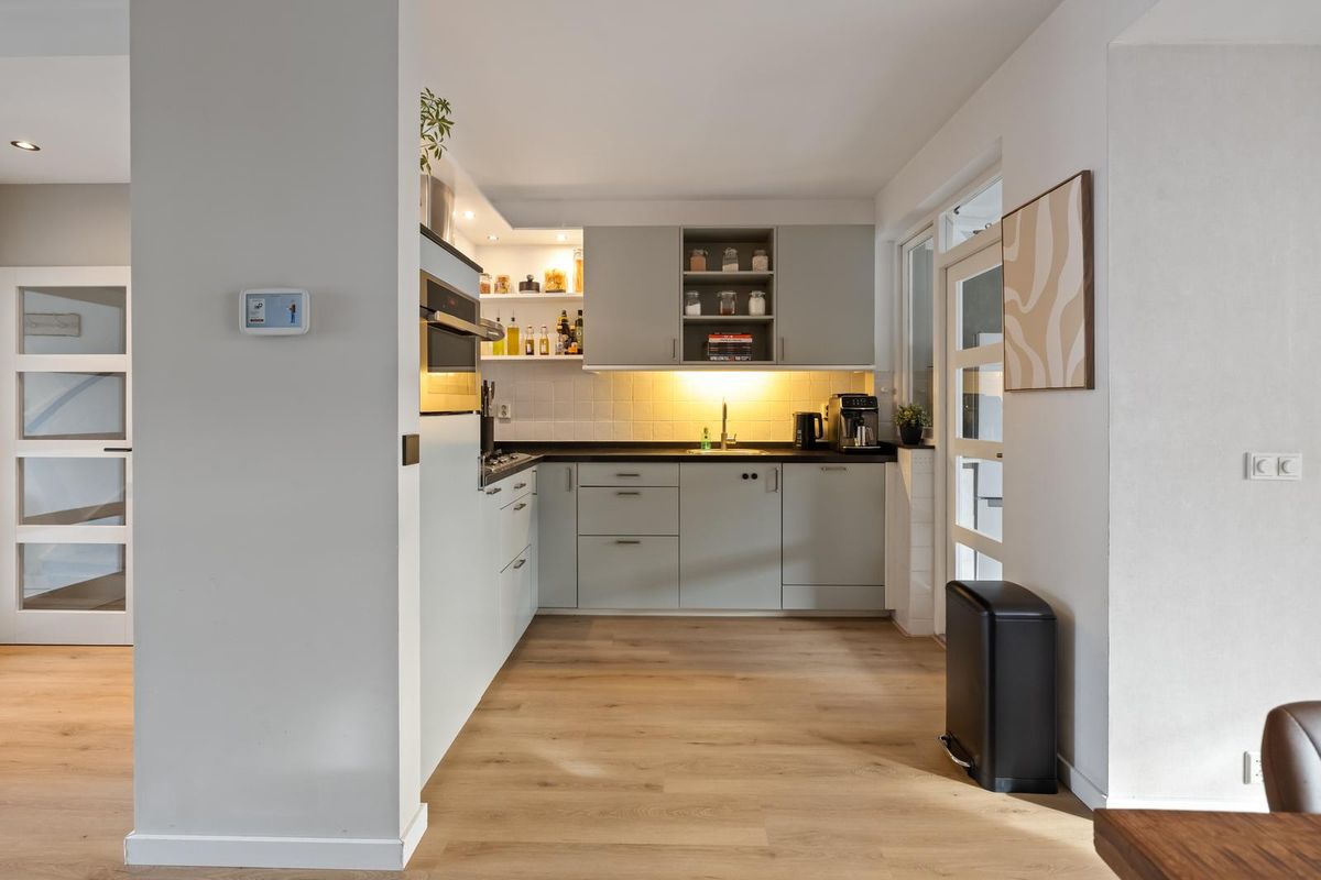 De woonkamer is licht en sfeervol en afgewerkt met een strakke PVC vloer die zorgt voor een rustige en eigentijdse uitstraling. De keuken in hoekopstelling vormt het hart van de woning en is uitgerust met inbouwapparatuur zoals een gaskookplaat, combi oven, vaatwasser, koelkast en afzuigkap. Aangrenzend bevindt zich een praktische bijkeuken met extra kastruimte, ideaal voor dagelijks gebruik.