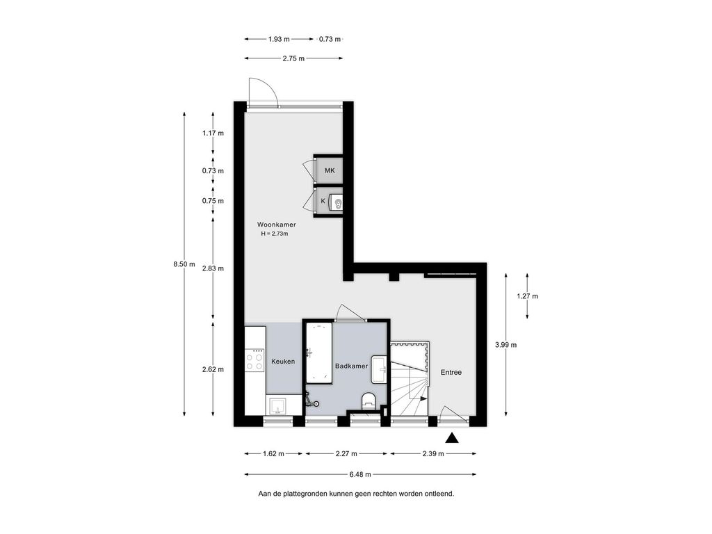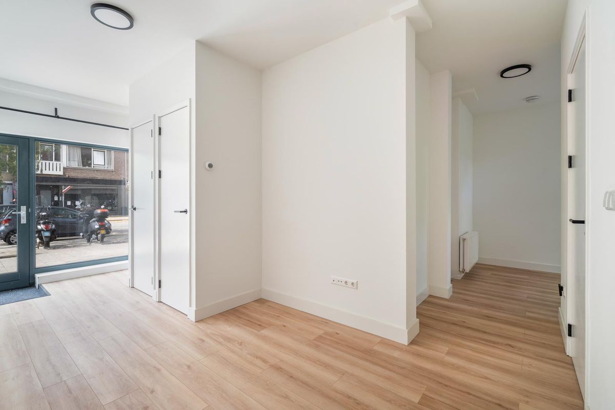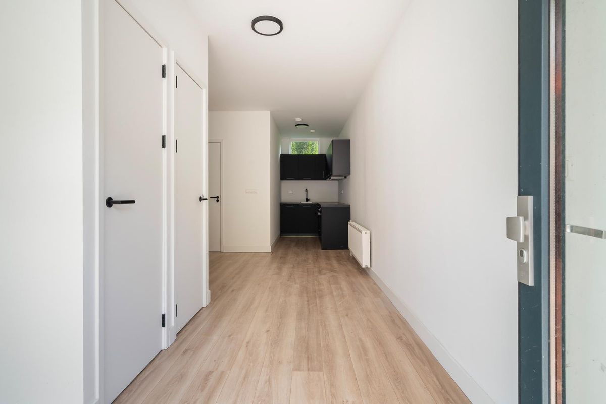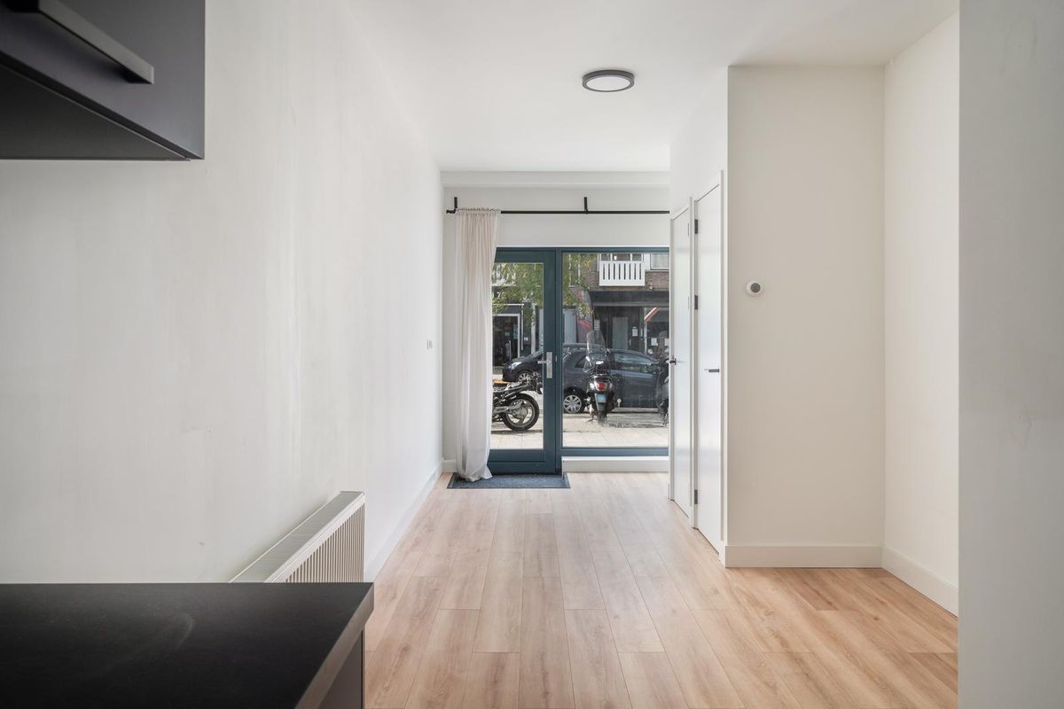 Begane grond: Entree, woonkamer en open keuken met grote raampartij en badkamer aan achterzijde