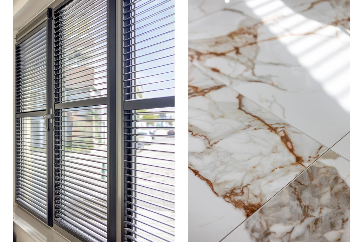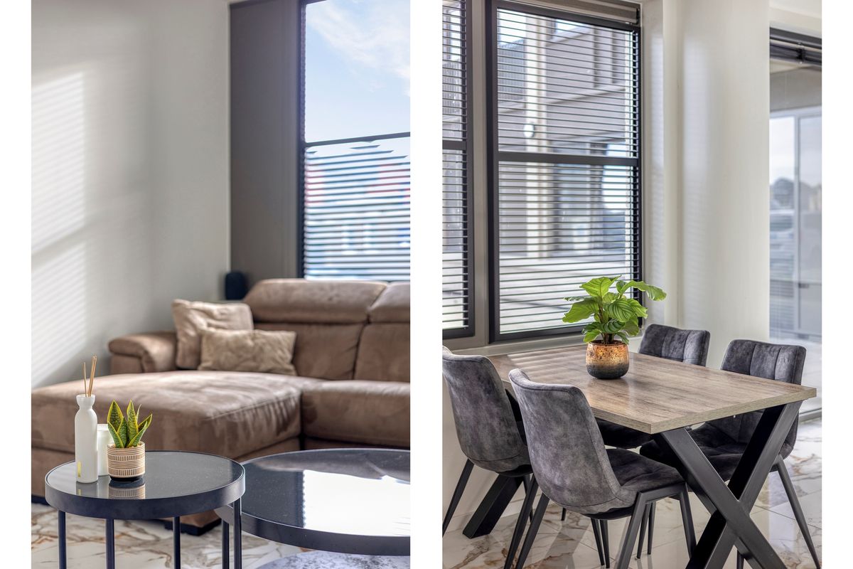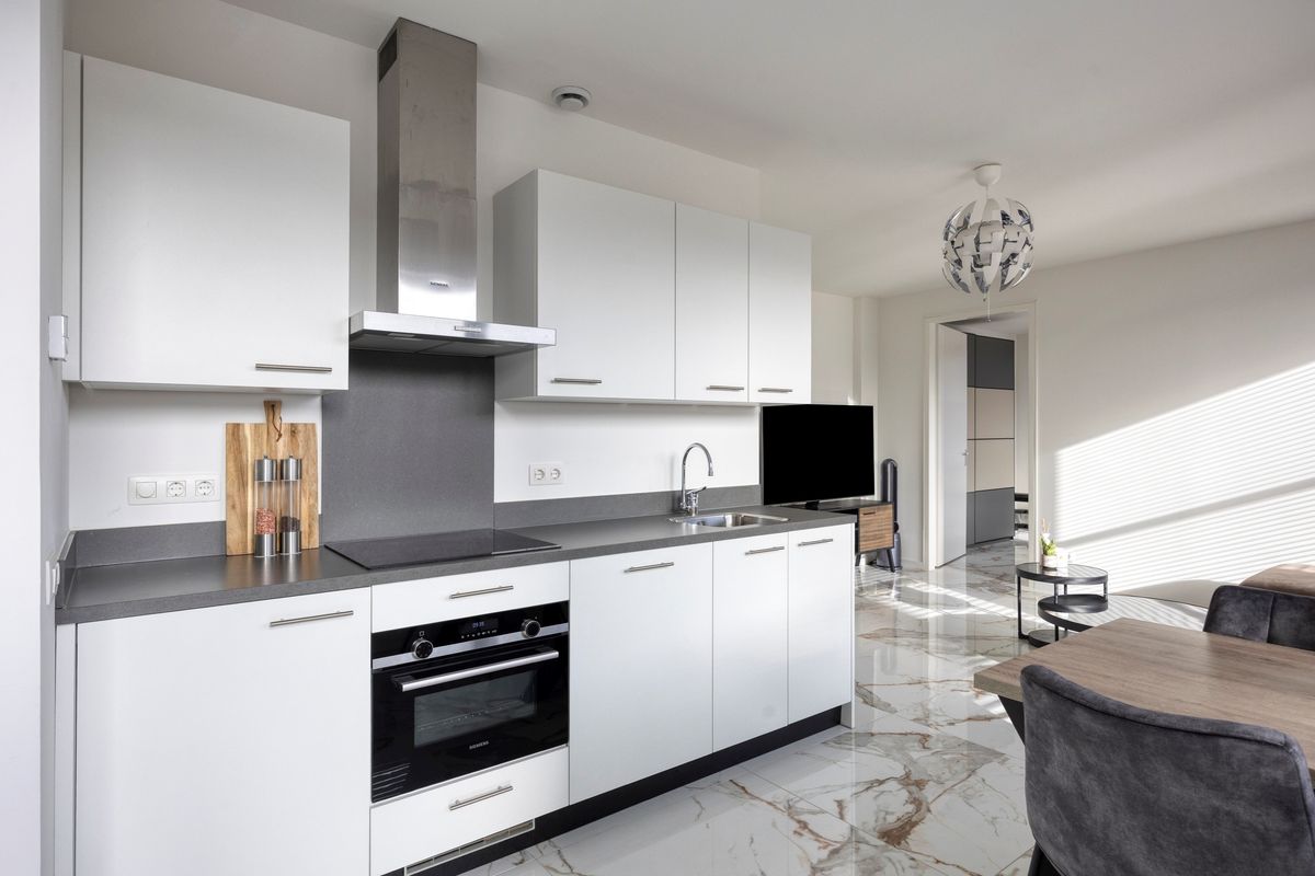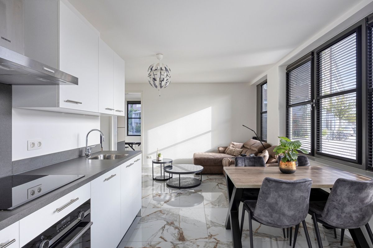 Via de hoofdingang bereik je vrijwel direct het appartement. Binnen kom je in een lichte woonkamer met open keuken, opvallend door de marmeren vloertegels en de overvloedige lichtinval. De keuken is strak en volledig uitgerust met moderne inbouwapparatuur: inductiekookplaat, combi-oven, koelkast, vaatwasser en afzuigkap. De woonkamer biedt ruimte om te ontspannen en nodigt uit tot gezellig samenkomen bij de eettafel.