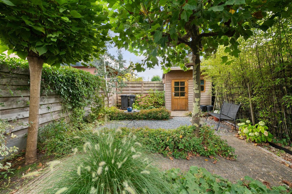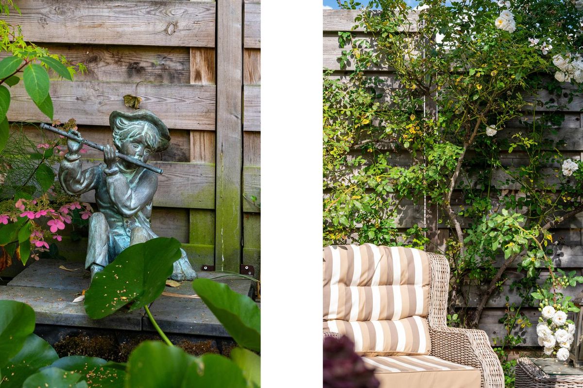 Achter het huis ligt een van de grootste pluspunten: de diepe, groene tuin. Vanaf het onderheide terras bij de woning loop je via een pad langs borders, bomen en