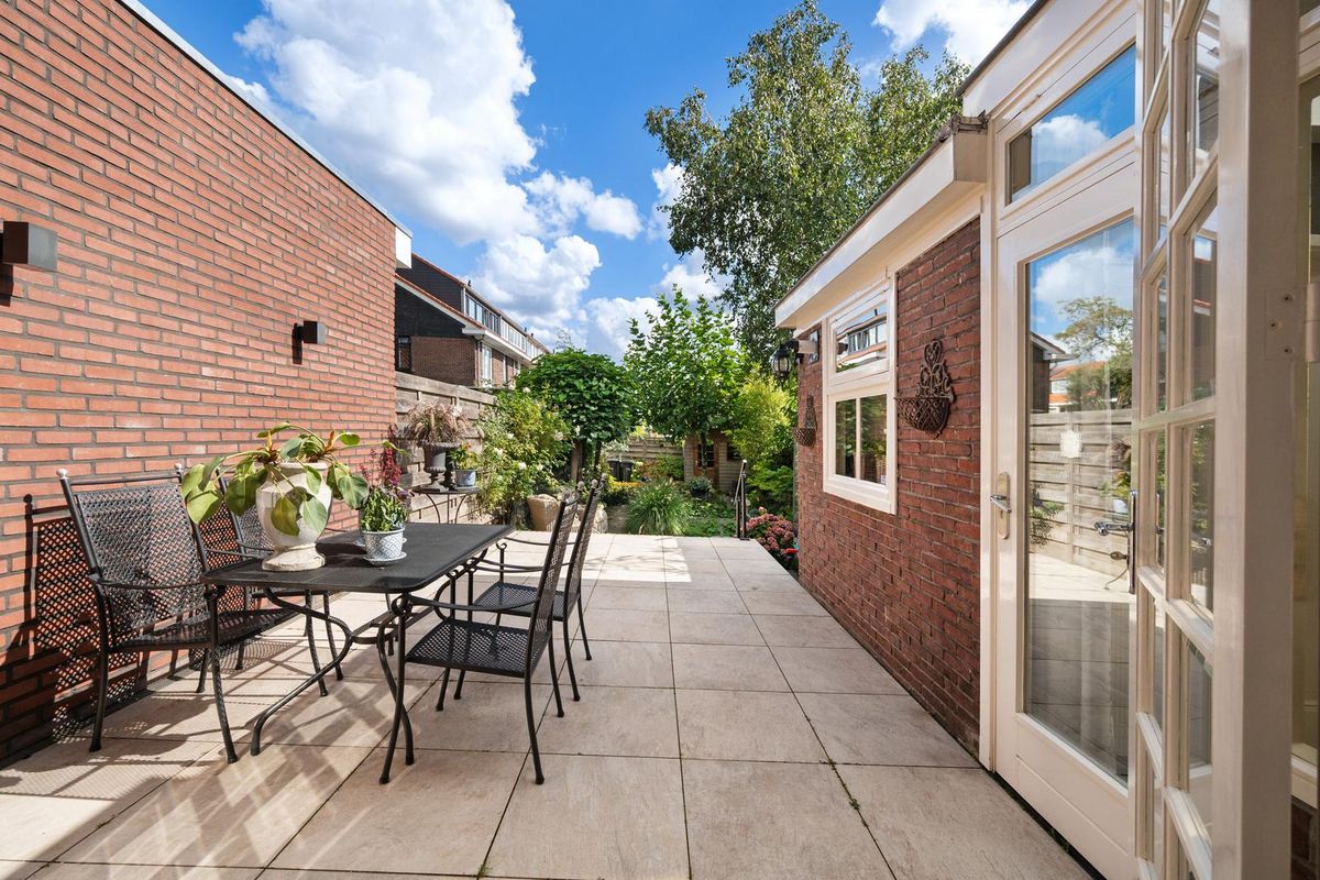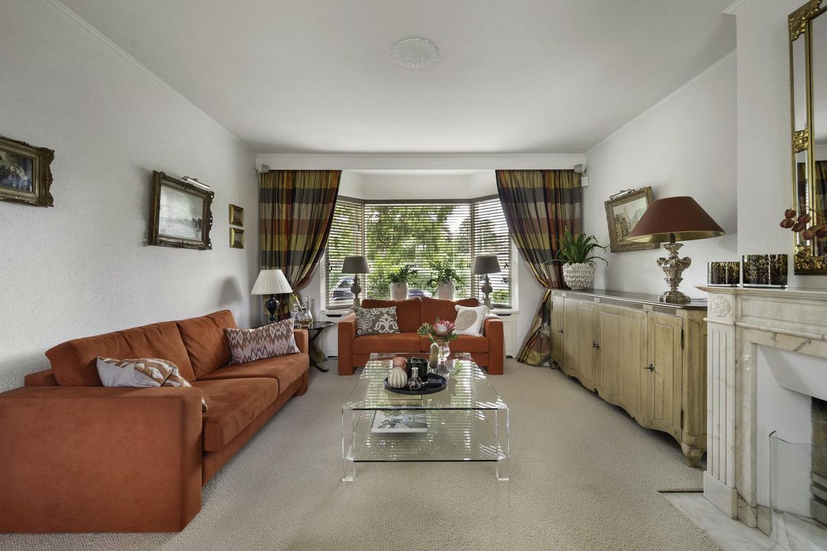 Aan de voorzijde ligt de living met erker en elektrisch bedienbare screens, waar het daglicht rijkelijk binnenvalt en je uitzicht hebt op de groene singel. Deze ruimte loopt naadloos door naar het achterste deel van de leefruimte, dat zich uitstekend leent als eetgedeelte. Hier openen dubbele deuren naar het terras met elektrisch bedienbaar zonnescherm en rolluik en de sfeervolle diepe achtertuin. Het onderheide terras biedt zich uitermate geschikt voor een uitbouw van formaat waardoor de leefruimte wordt vergroot naar de wensen van nu.