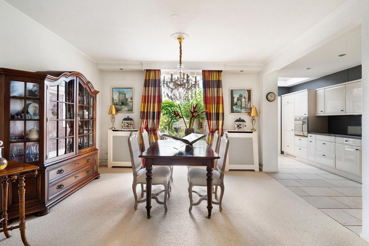 At the front, the living room with bay window and electric screens allows natural light to stream in, offering views of the green canal. The space flows seamlessly into the rear, perfectly suited as a dining area. Here, double doors open to the terrace with an electric sunshade and roller shutter, leading into the atmospheric deep garden. The reinforced terrace is ideal for a sizable extension, allowing you to expand the living space in line with modern needs.
