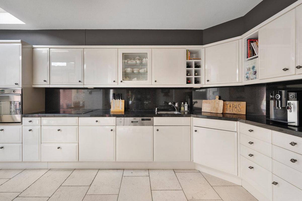 De keuken met granieten aanrecht en inbouwapparatuur en inductie kookplaat grenst aan de leefruimte en biedt volop kastruimte. Direct ernaast ligt de bijkeuken met aansluiting voor wasmachine en droger en ruimte kasten.