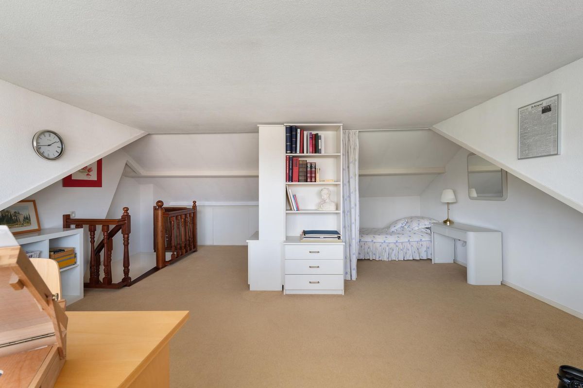 The attic surprises with a large third bedroom, accessed via a fixed staircase. Thanks to the dormer window, this space is filled with natural light and can easily be used as a bedroom, home office, or playroom. Extra storage is tucked away beneath the sloping roof.