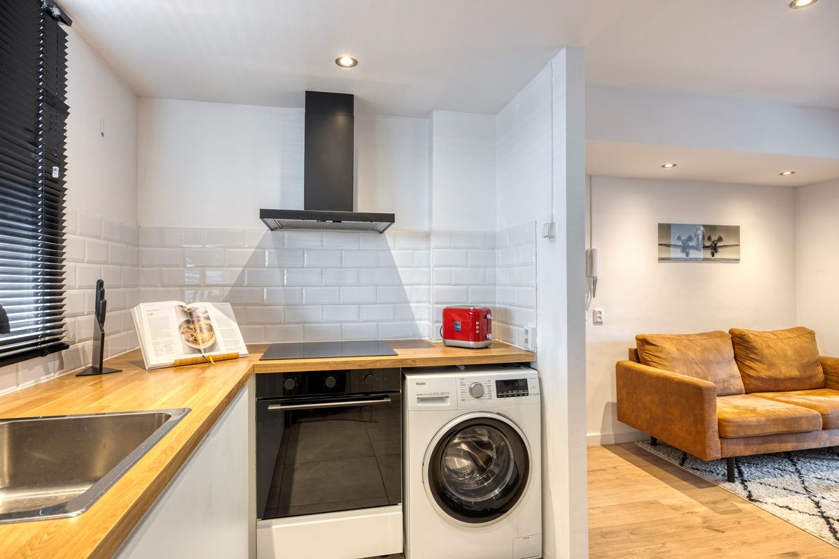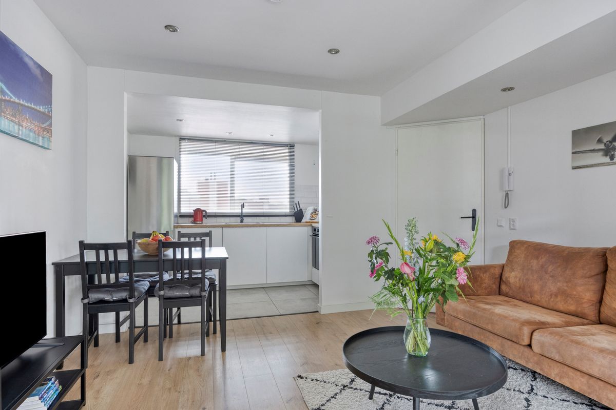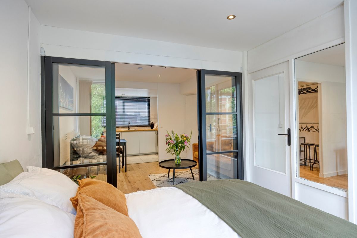 De in hoek opgestelde keuken, voorzien van een moderne keukeninrichting met inbouwapparatuur en wasmachineaansluiting, grenst aan de woonkamer. De woonkamer biedt ruimte aan een gezellige bank en een eetkamer en wordt middels mooie schuifdeuren gescheiden van de slaapkamer. Via de slaapkamer kom je in de tweede slaapkamer, of werkkamer, met toegang tot een grote inloopkast en een heerlijk balkon.