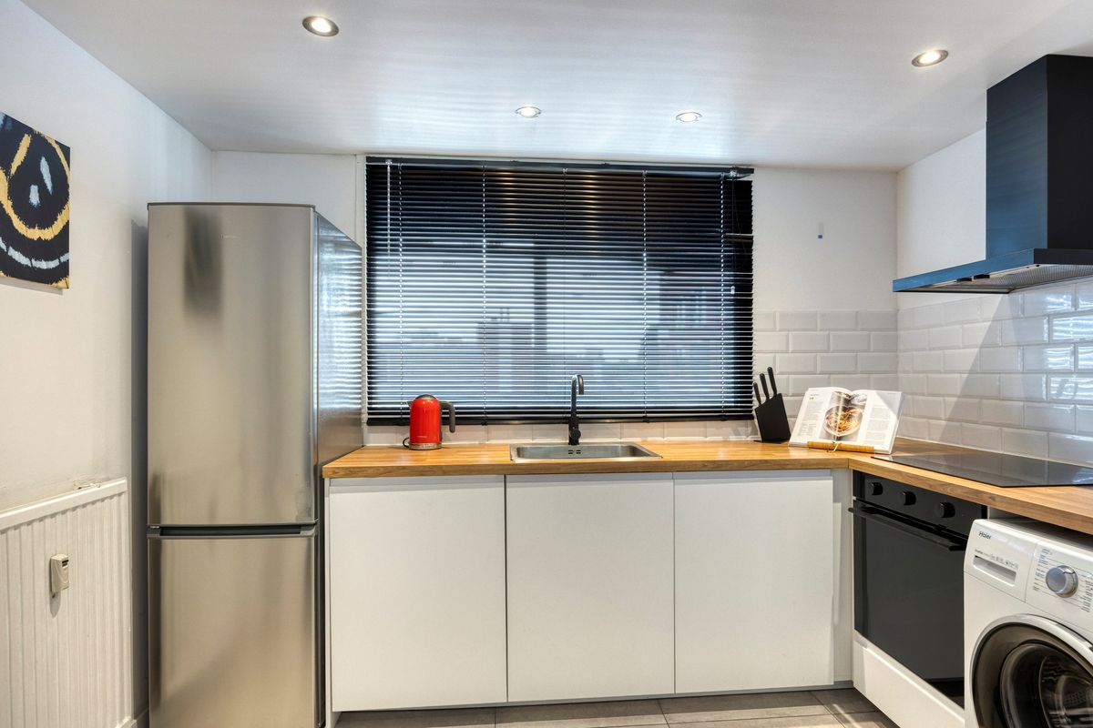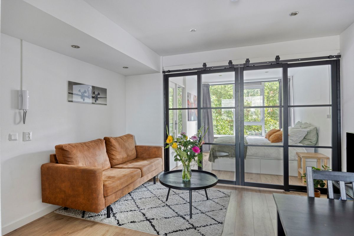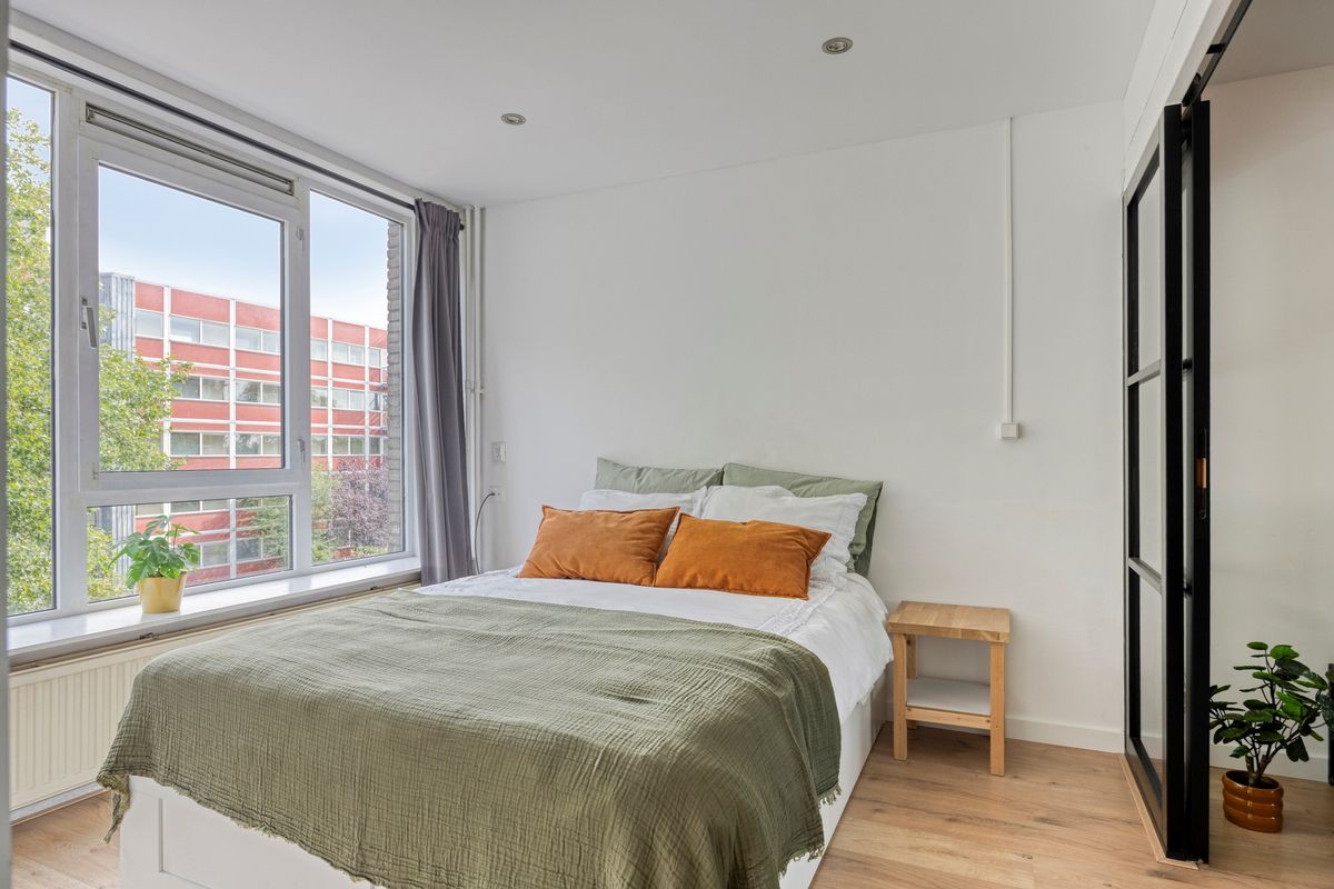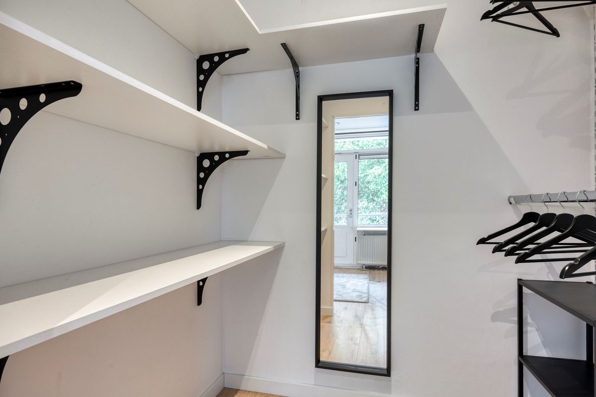 De in hoek opgestelde keuken, voorzien van een moderne keukeninrichting met inbouwapparatuur en wasmachineaansluiting, grenst aan de woonkamer. De woonkamer biedt ruimte aan een gezellige bank en een eetkamer en wordt middels mooie schuifdeuren gescheiden van de slaapkamer. Via de slaapkamer kom je in de tweede slaapkamer, of werkkamer, met toegang tot een grote inloopkast en een heerlijk balkon.