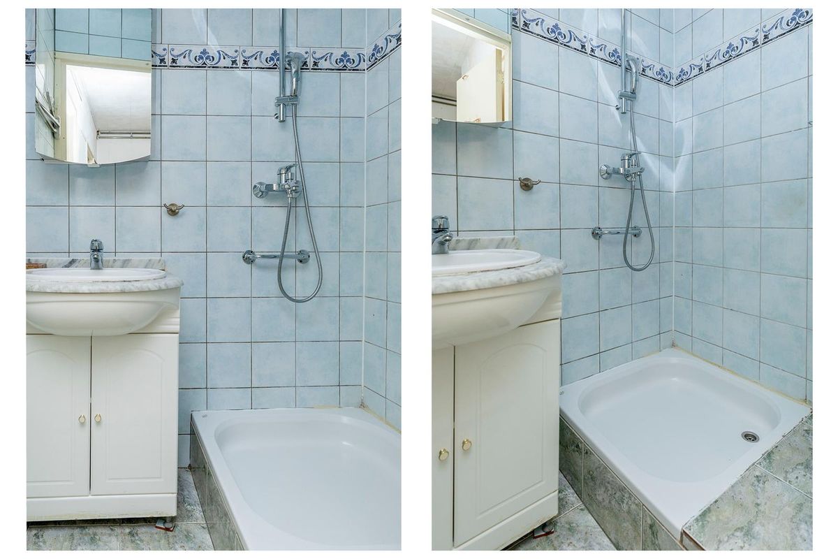 * De volledig betegelde badkamer is voorzien van een douchecabine en wastafelmeubel.