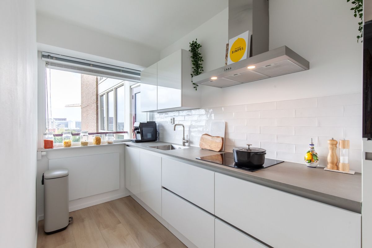 Aan de galerijzijde is de moderne, witte keuken. De keuken beschikt over diverse inbouwapparatuur zoals een inductiekookplaat, oven, vaatwasser, een koel-/vriescombinatie en biedt meer dan voldoende kastruimte. Het werkblad is van keramiek.