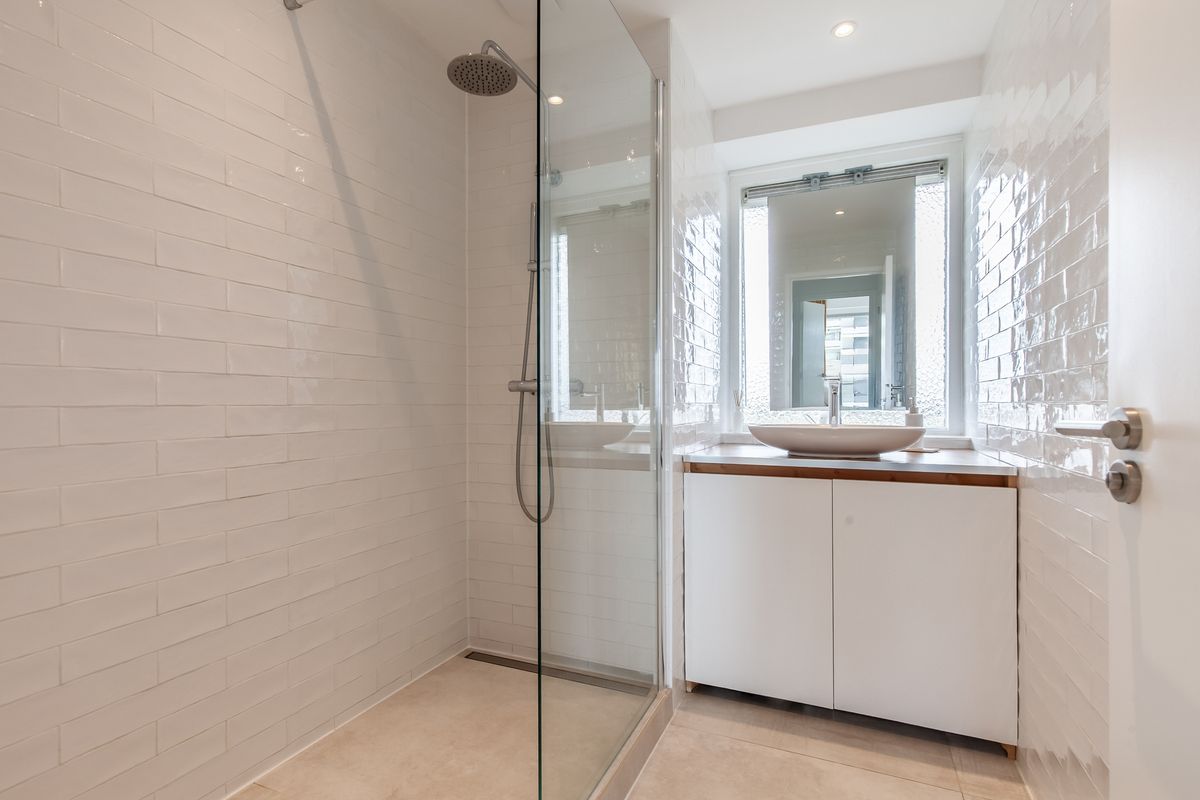 De moderne badkamer met beton-look vloertegels en een mooie witte tegel aan de wand is goed ingedeeld. Je hebt een wastafelmeubel met elegante wasbak en een ruime inloopdouche met glazen wand. Ook is hier de aansluiting voor de wasmachine.