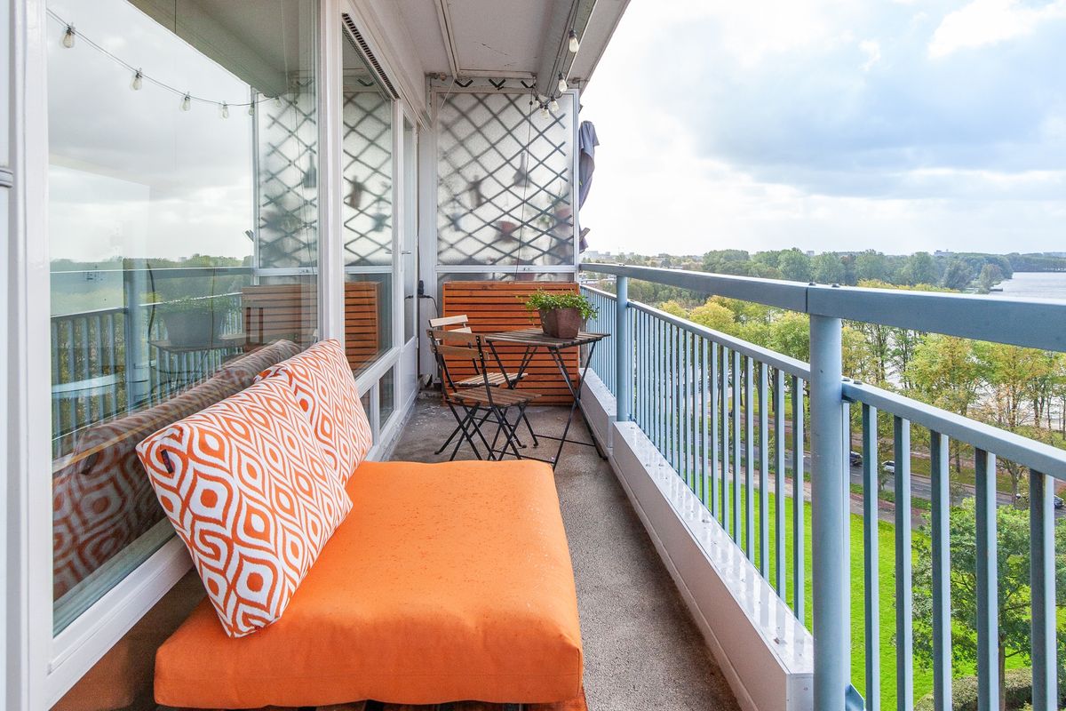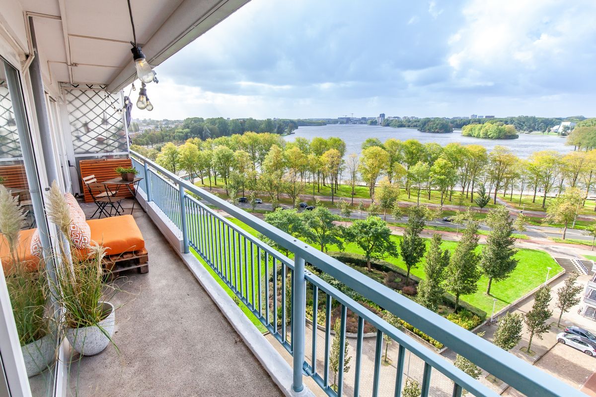 Het 12 m2 balkon en is gelegen op het westen waardoor je er heerlijk van de zon en het spectaculaire uitzicht over de Sloterplas kunt genieten.