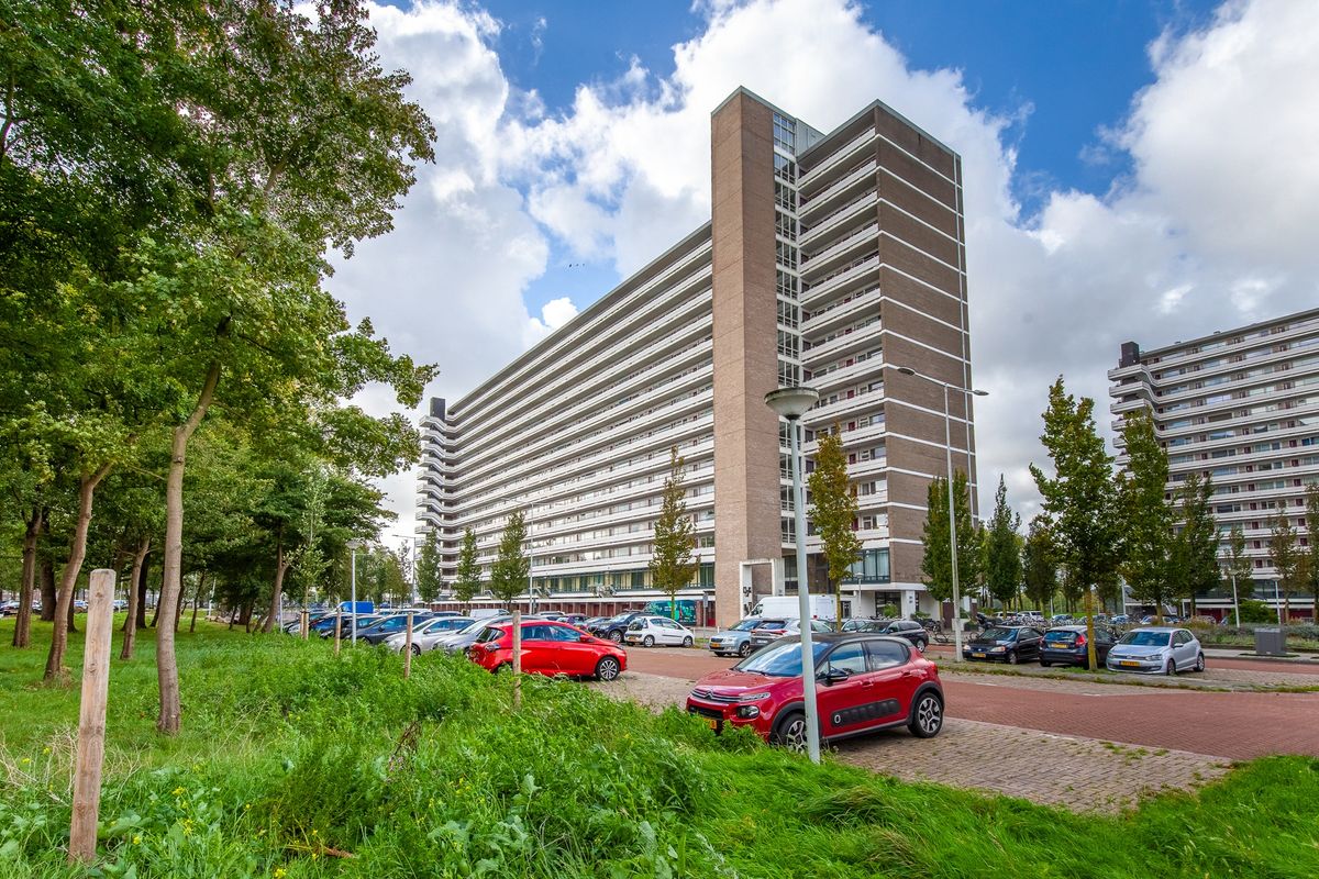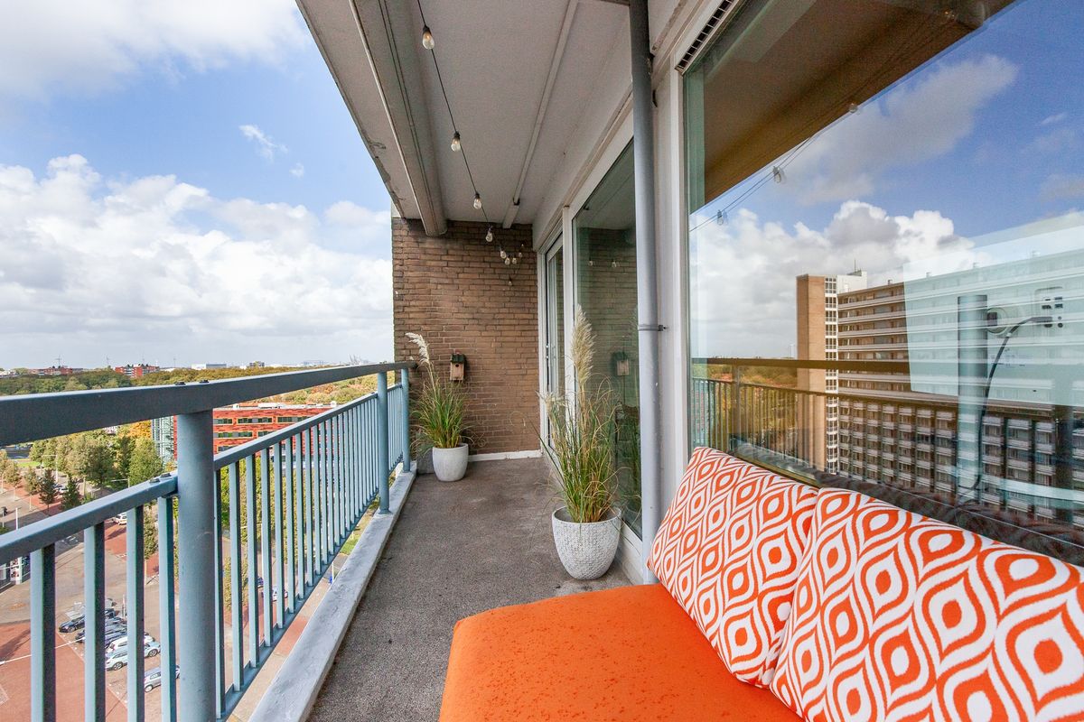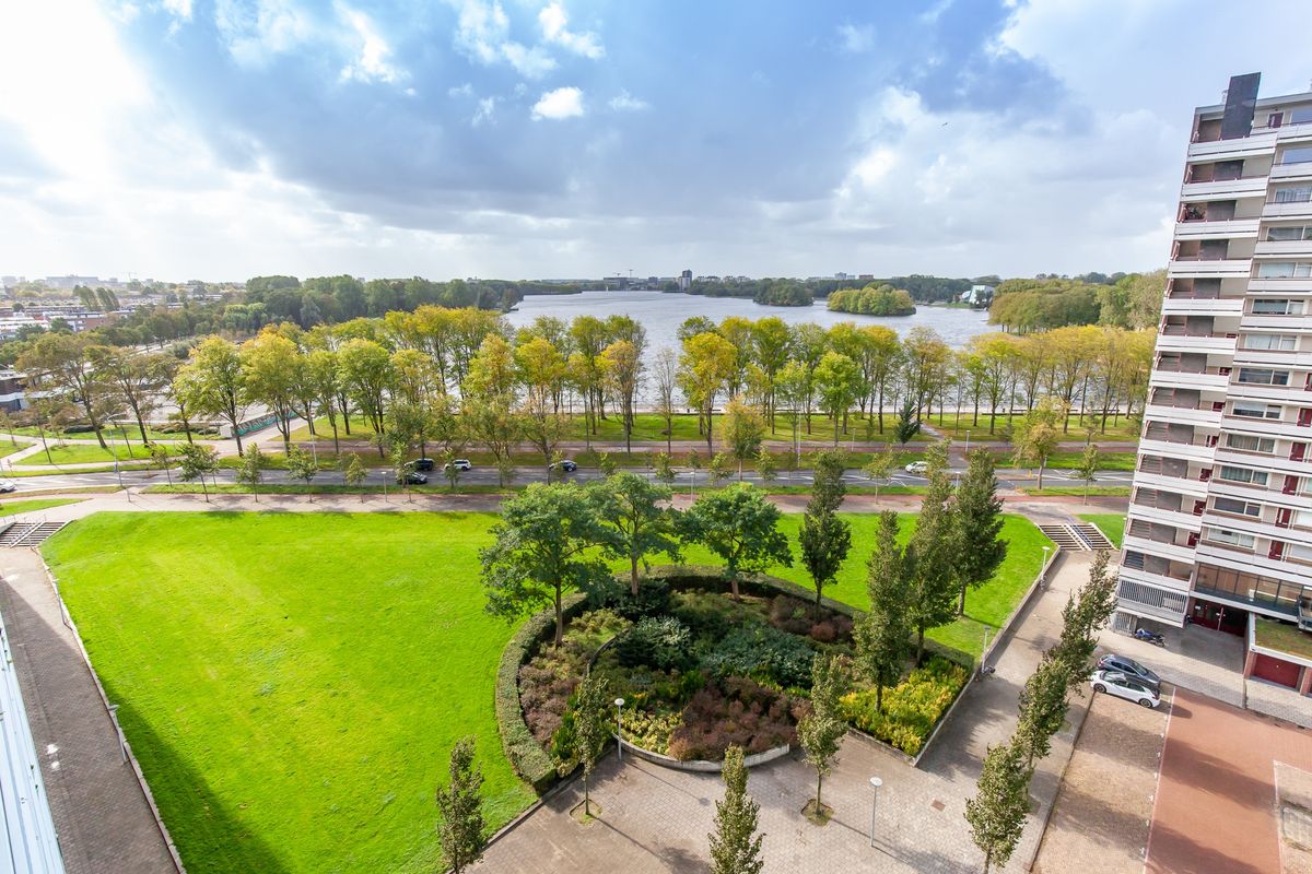 Het appartement op de negende verdieping ligt in een goed onderhouden appartementencomplex met 2 liften gebouwd in 1964 door architect Piet Zanstra. Het complex ligt in de Westelijke Tuinsteden, dat is ontworpen op basis van de principes Licht, Lucht en Ruimte. De omgeving én het complex ademen deze principes: er valt maximaal licht naar binnen in het appartement en je kunt genieten van een fantastisch uitzicht over het water en het groen.