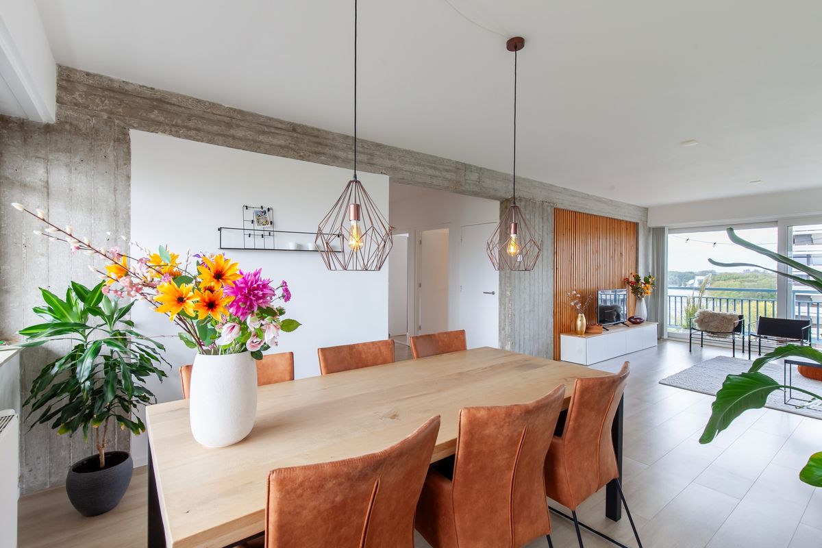 The bright through-lounge faces west and features a 4 metre-wide sliding door opening onto the balcony. With windows on both the east and west sides, the space is filled with natural light. The combination of wood and concrete gives the apartment a unique and serene appearance. A 2-metre-wide mirrored wall creates a striking feature, offering stunning views of the Sloterplas from the moment you enter. The ceiling height of 2.62 m adds to the sense of space, while the same well-maintained laminate flooring runs throughout the entire apartment.