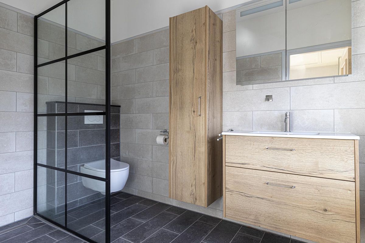 Aan de achterzijde bevindt zich de ruime recent vernieuwde badkamer met inloopdouche, hangend toilet en wastafelmeubel.