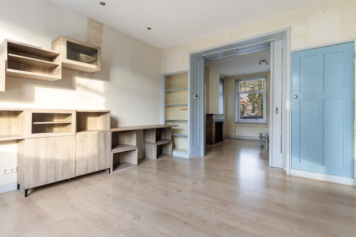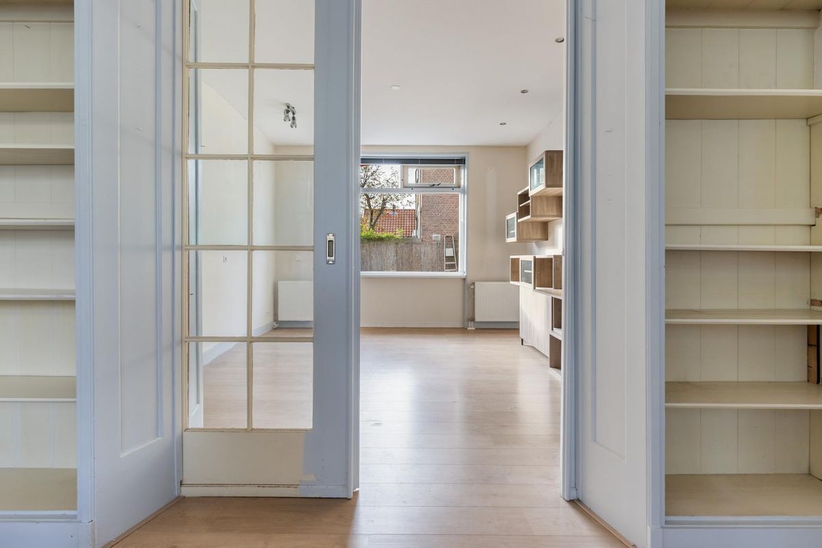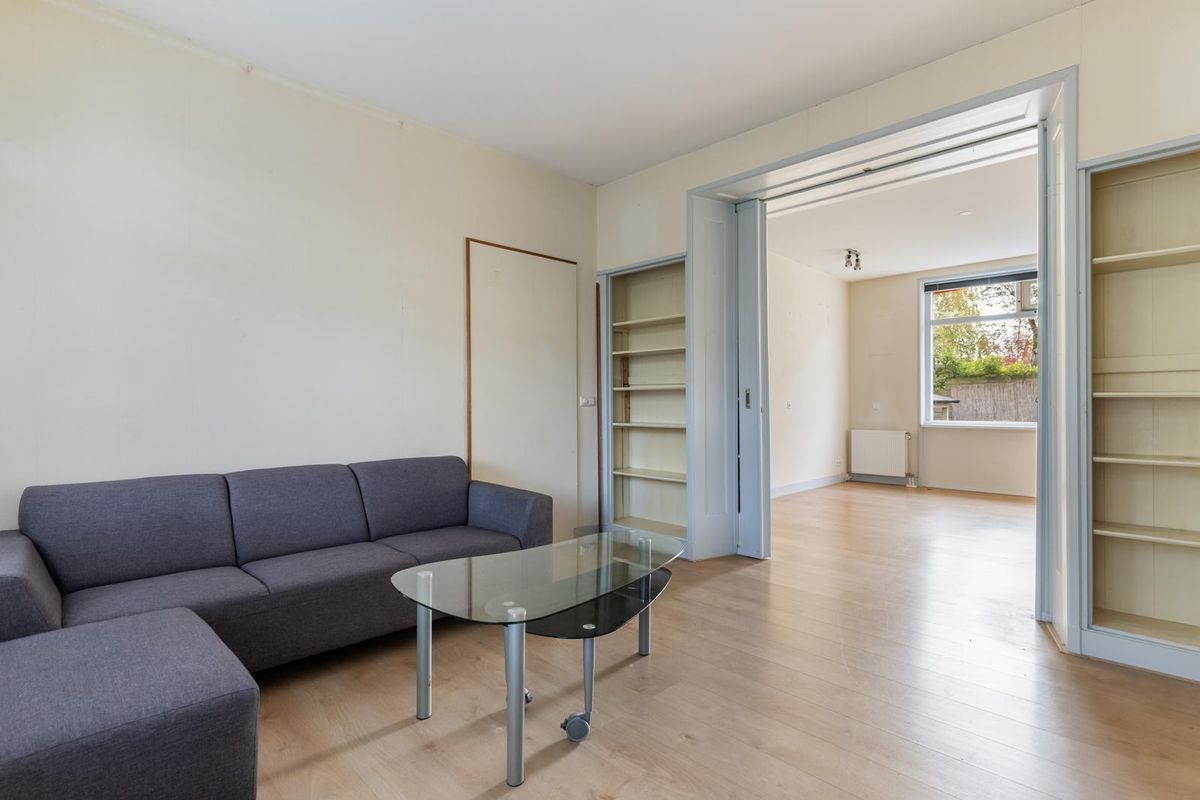 De living is v.v. een viertal ruime vaste kasten en originele schuifdeuren. Het zitgedeelte aan de achterzijde heeft direct contact met de achtertuin.