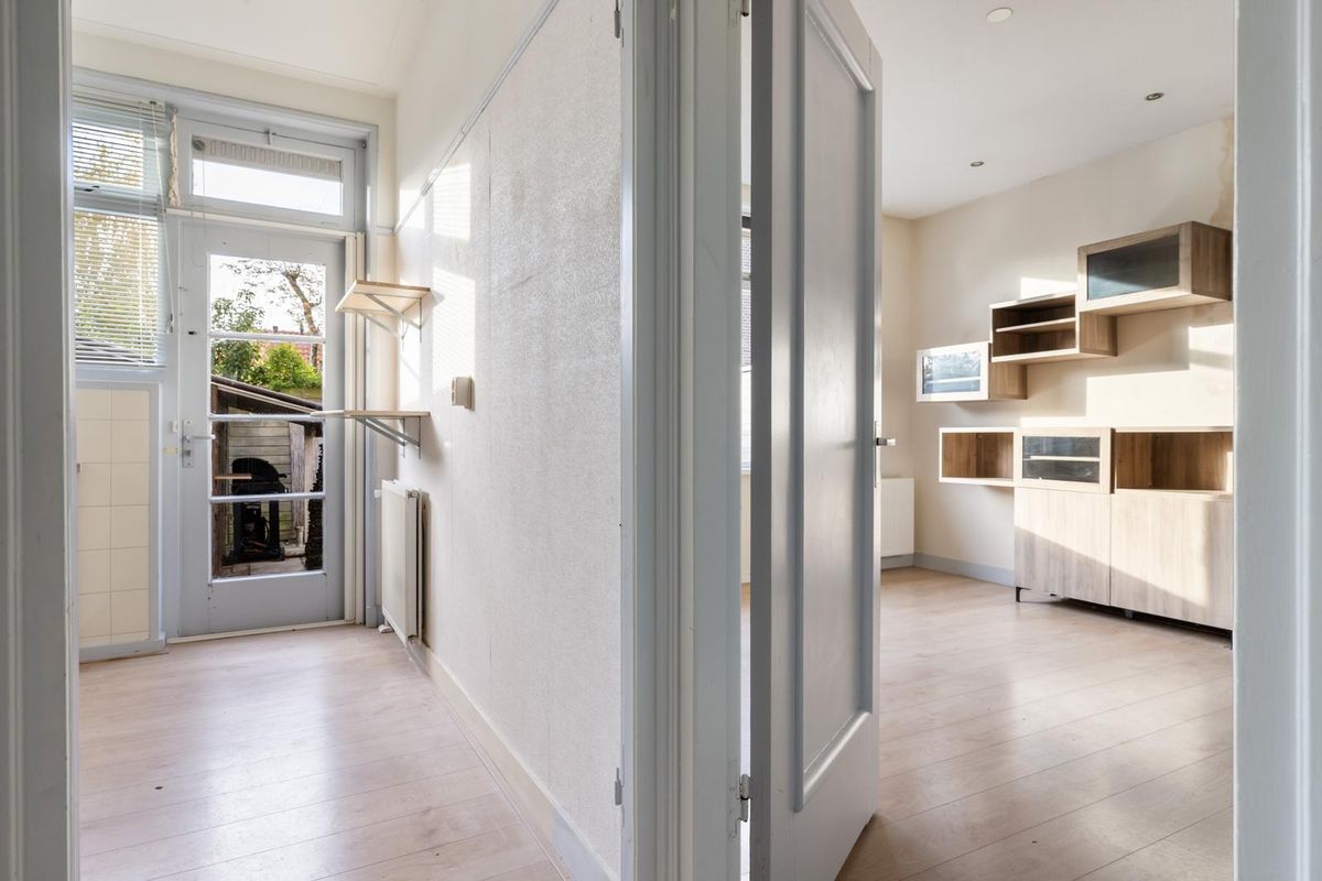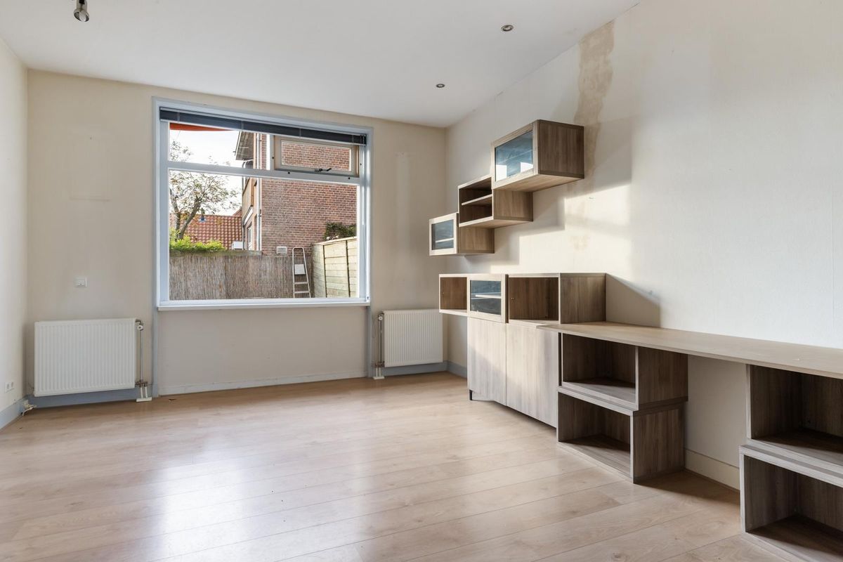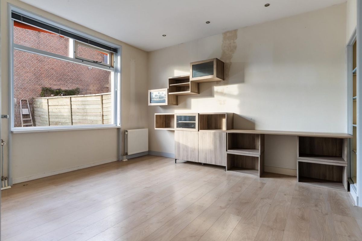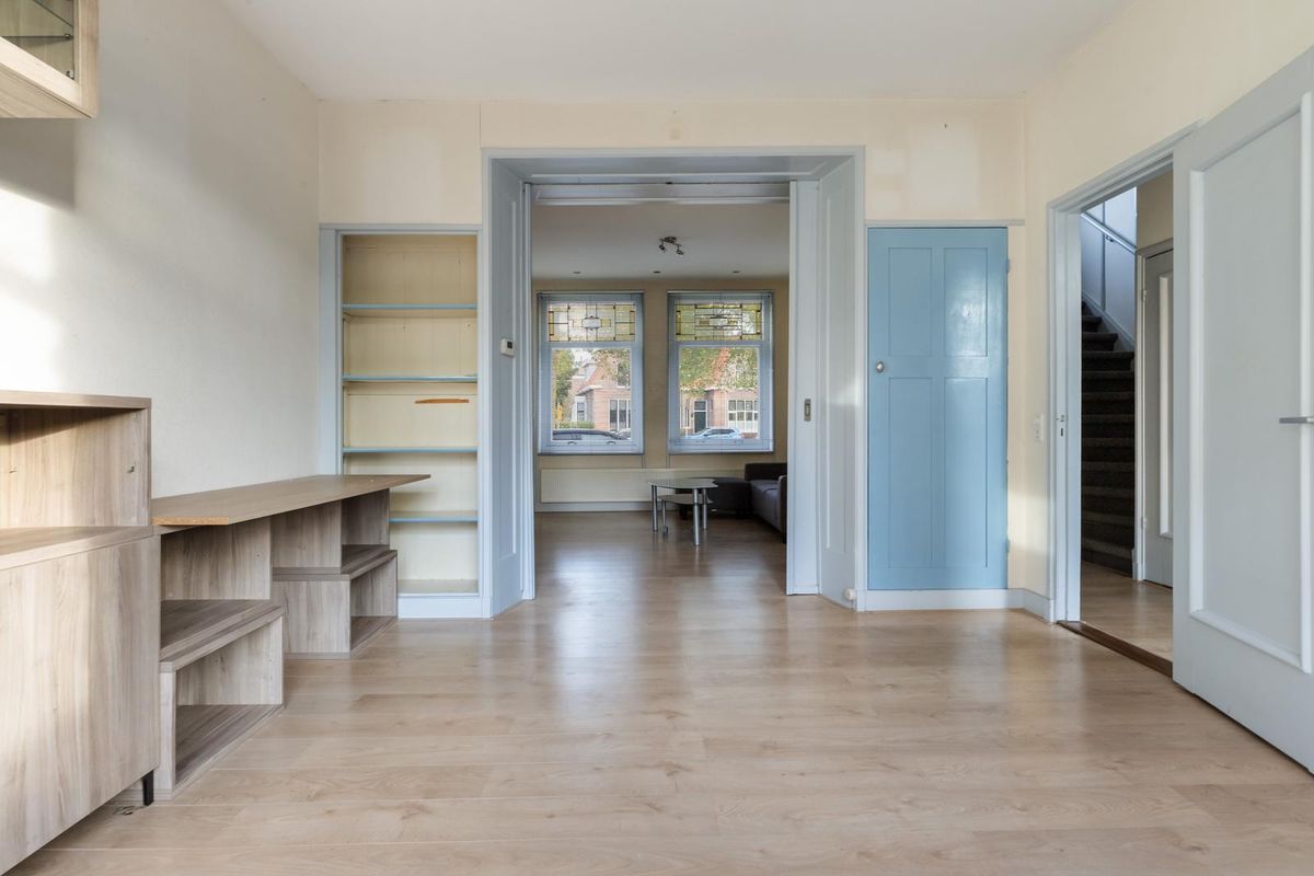 De living is v.v. een viertal ruime vaste kasten en originele schuifdeuren. Het zitgedeelte aan de achterzijde heeft direct contact met de achtertuin.