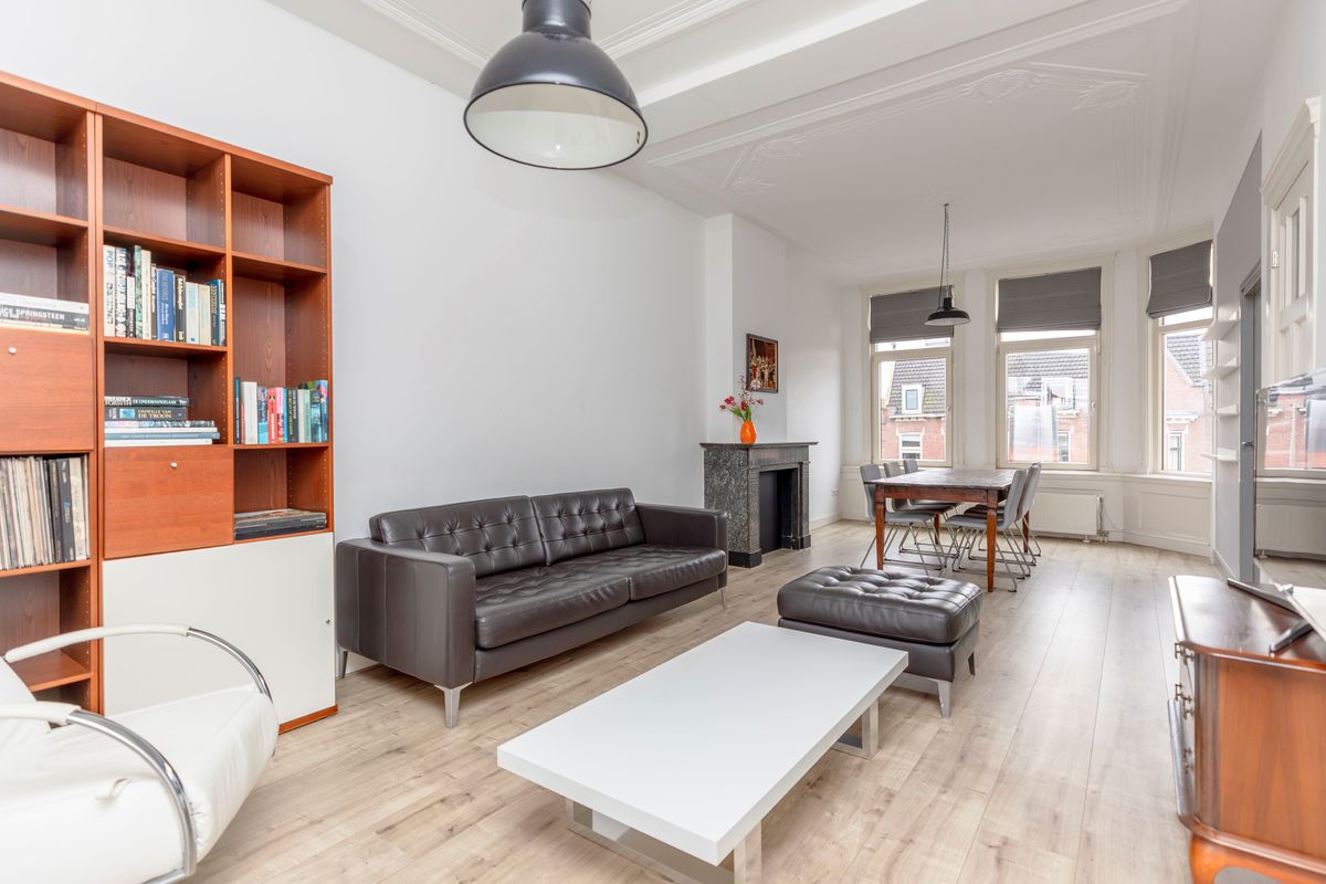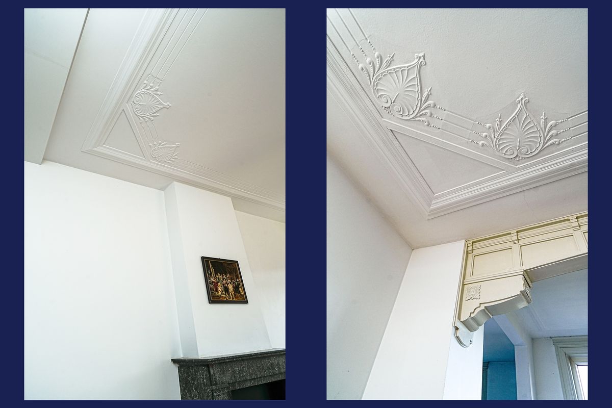 Wat direct opvalt in de woonkamer is de overvloed aan licht dankzij de grote raampartijen aan zowel de voor- als achterzijde. De sierlijke plafondlijsten en de originele marmeren schouw geven de ruimte extra karakter en een warme, klassieke uitstraling. Waar de woonkamer vroeger was opgedeeld in een voor-, tussen- en achterkamer, is het nu één royale leefruimte met een open, ruimtelijk gevoel.