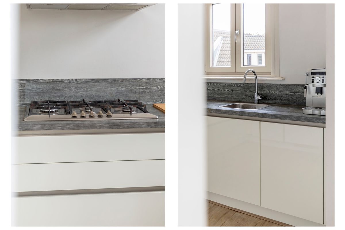 Aan de achterzijde bevindt zich de halfopen keuken, uitgevoerd in tijdloos wit met een houtlook aanrechtblad. De keuken is compleet met diverse inbouwapparatuur, waaronder een 5-pitsgaskookplaat met RVS-afzuigkap, vaatwasser, combi oven/magnetron en koelkast. Vanuit hier kijk je leuk uit over de binnentuinen aan de achterzijde van de woning.