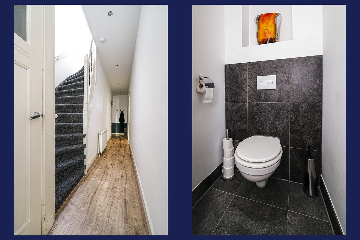Bij binnenkomst in de hal vind je direct toegang tot het nette toilet en de trap naar de bovenverdieping. Vanuit de hal stap je de ruime, sfeervolle doorzonwoonkamer binnen met een halfopen keuken en een gezellige voor-/zijkamer.