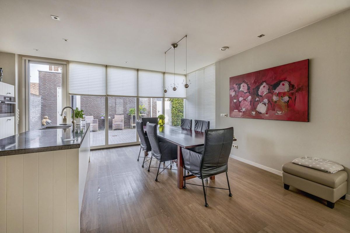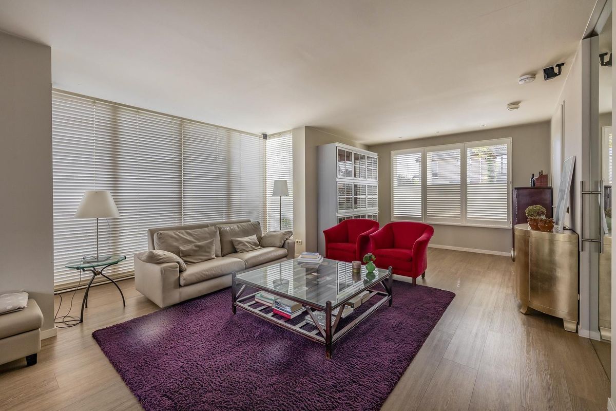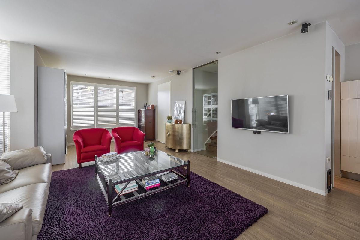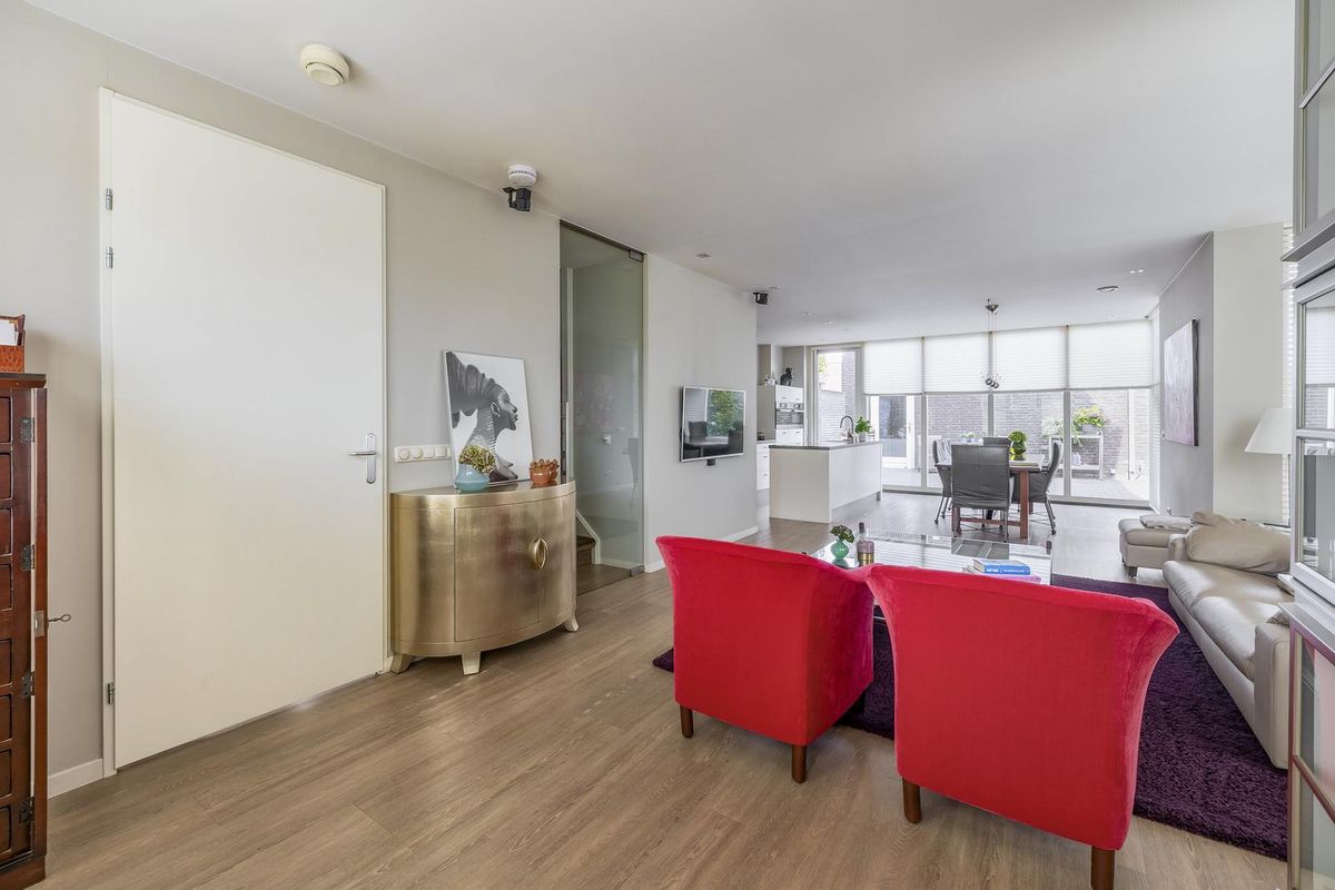 De woonkamer is, door de aanbouw aan de achterzijde, ruim. Wat meteen opvalt is het heerlijke licht dat door de grote raampartijen binnenvalt. Je geniet in de woonkamer nog steeds van een hoge mate aan privacy.