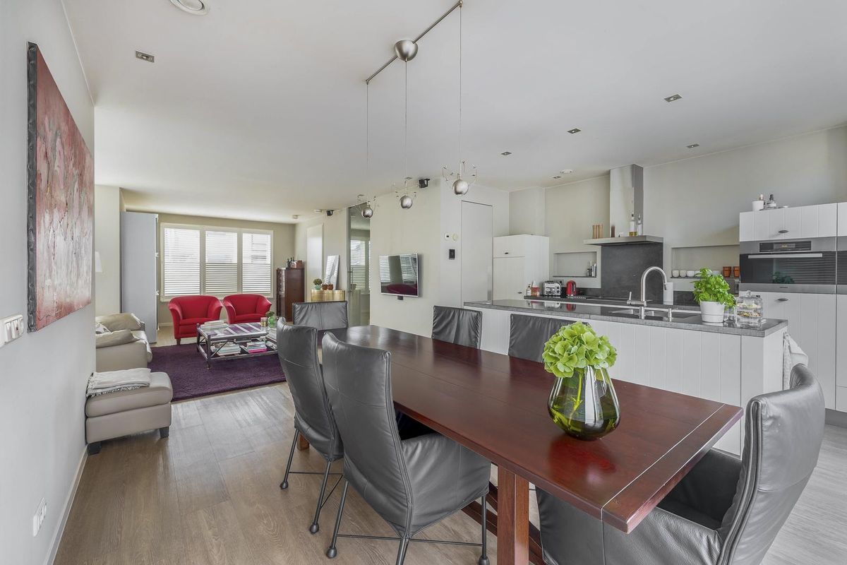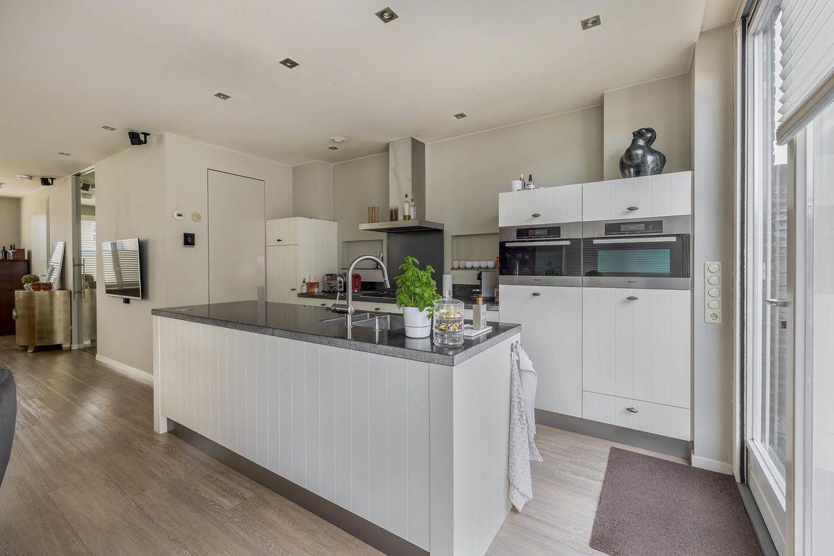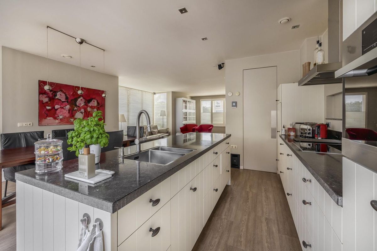 De open keuken is op maat gemaakt. Het eiland met spoelbak en veel kastruimte is voorzien van een royaal natuurstenen werkblad. Verder beschikt de keuken over een koelkast, inductiekookplaat, afzuigkap, vaatwasser, combi oven/magnetron en stoomoven.