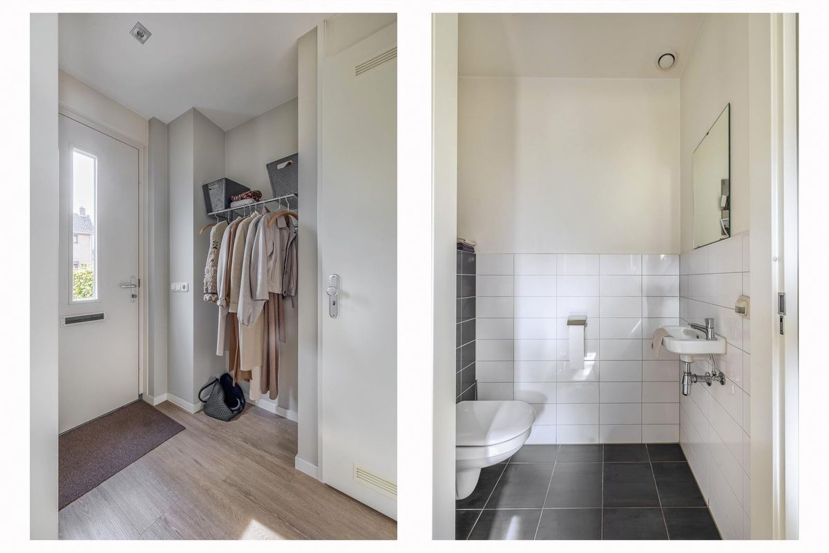 Entreel/hal met meterkast, garderobenis en toiletruimte met hangcloset en fonteintje.