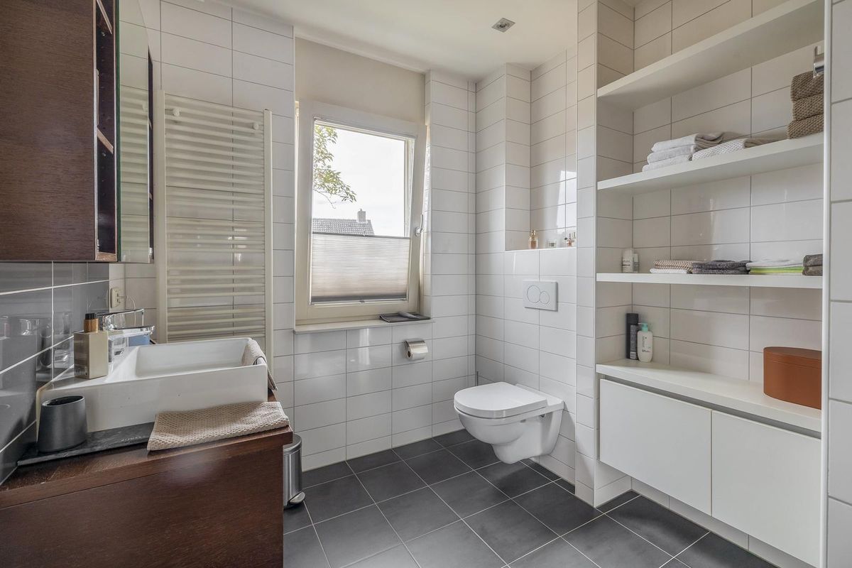 De badkamer is geheel betegeld en voorzien van een inloopdouche, toilet, wastafelmeubel en designradiator.