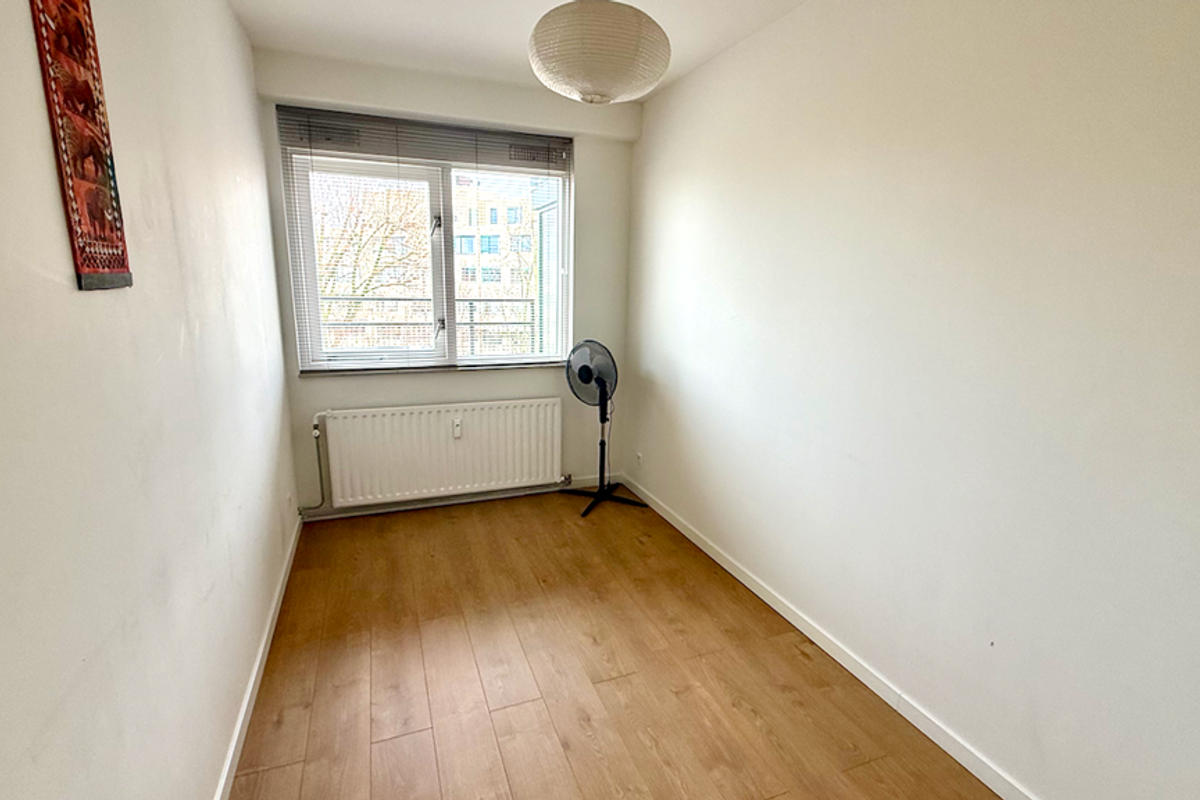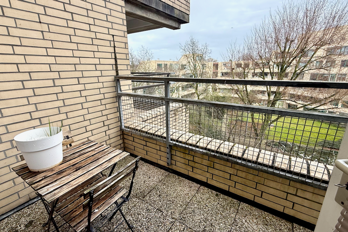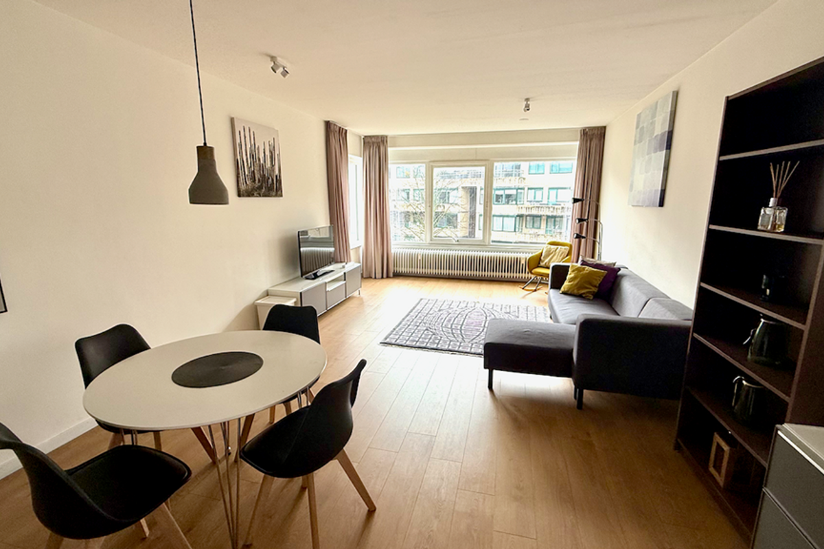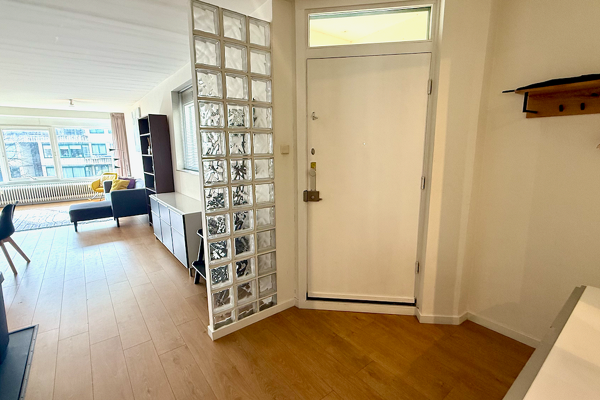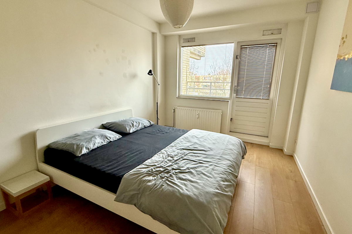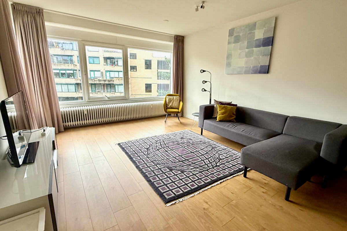 Shared main entrance with elevator to the 4th floor. Entrance to the apartment with a hallway and doors to all the rooms. Spacious and bright living room with doors to the balcony. Tastefully decorated and furnished. Open kitchen with bar and appliances such as dishwasher, oven, microwave, sink, freezer / fridge, induction stove and ample storage space. Master bedroom with big windows, a wardrobe and comfortable double bed. The 2nd bedroom can be used as a study or home office or sleeping room. Bathroom with walk-in shower, towel radiator and sink. Seperate toilet with faucet. A washing machien / dryer combination is available. Centrally heated and laminate flooring throughout the apartment. Fully double glazed.