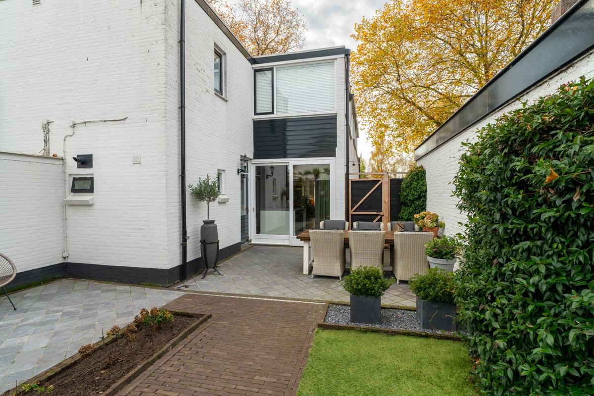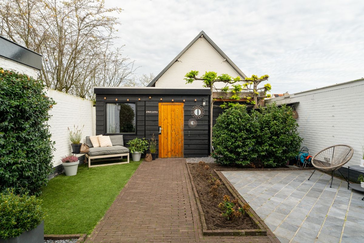 De tuin aan de achterzijde is volledig vernieuwd en biedt volop privacy. Hier geniet je van sierbestrating, kunstgras, borders en een terras voor lange zomeravonden. Achterin de tuin staat een vernieuwde en geïsoleerde berging over de volledige breedte van de tuin. Deze is uitgerust met een airco om zowel te koelen als te verwarmen. Hierdoor is het een heerlijke plek om te werken, hobbyen of is hij zelfs als extra slaapruimte te gebruiken. Dankzij de goede drainage blijft de tuin altijd netjes droog.