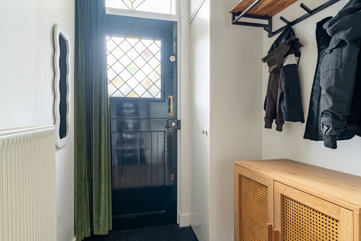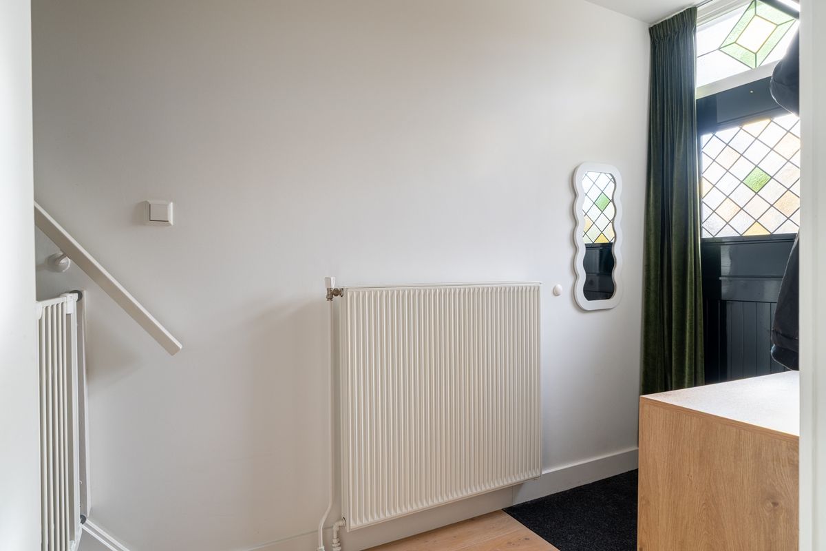 De karaktervolle voorgevel met glas-in-loodramen en sfeervolle shutters nodigt je direct uit om binnen te stappen. In de hal vind je de trapopgang, garderobe, meterkast en toegang tot de woonkamer.