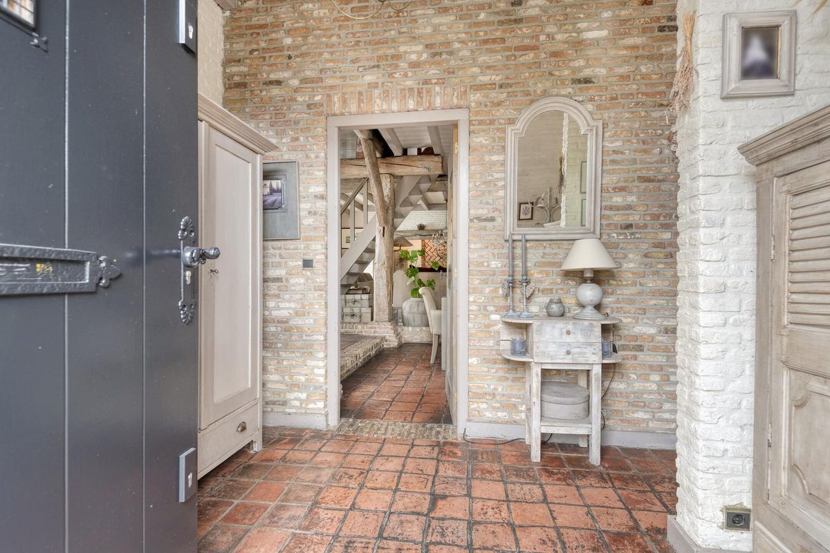 Nadat je je auto voor de garage hebt geparkeerd ga je naar de voordeur. Je komt in de hal waar onder ander het toilet is. In de hal is ook de meterkast welke voorzien is van 8 lichtgroepen en 2 aardlekschakelaars. De rode antieke tegels als het balken plafond geven de woning een warme sfeer. Deze elementen zien we ook verder in de woning.