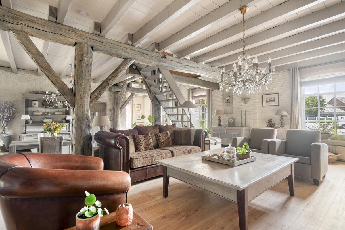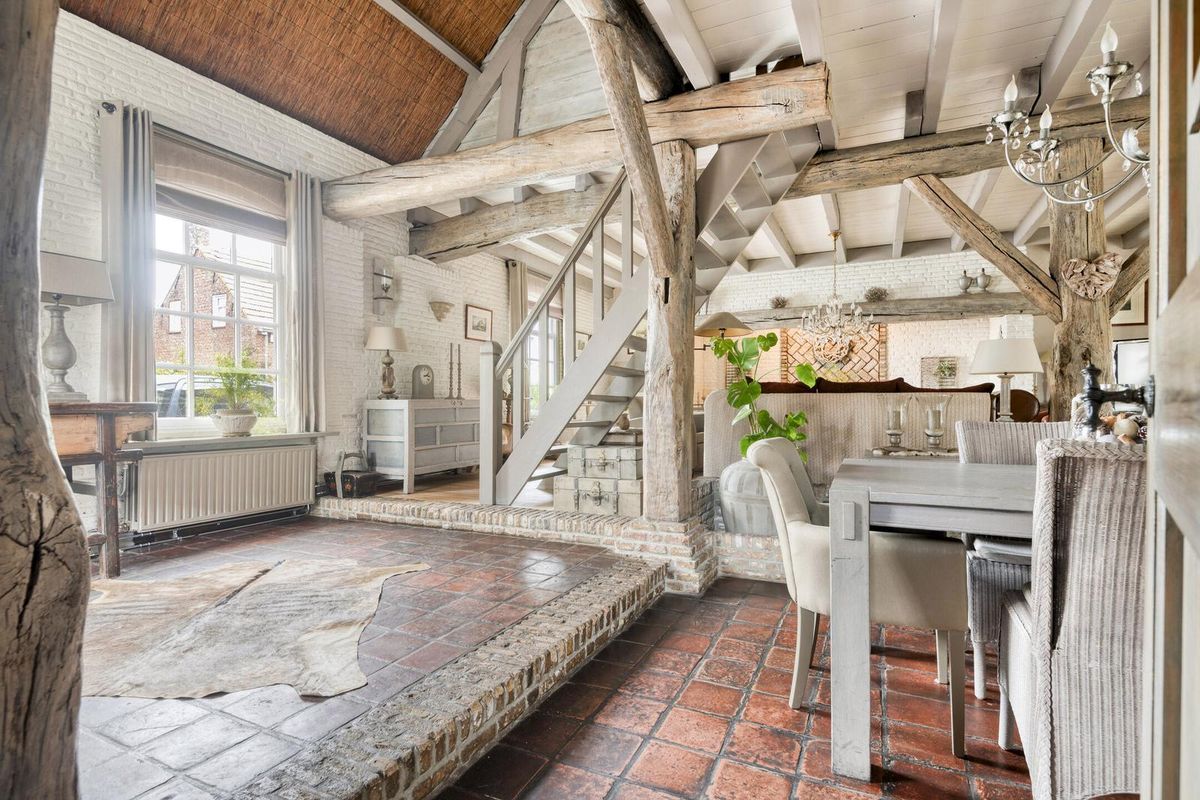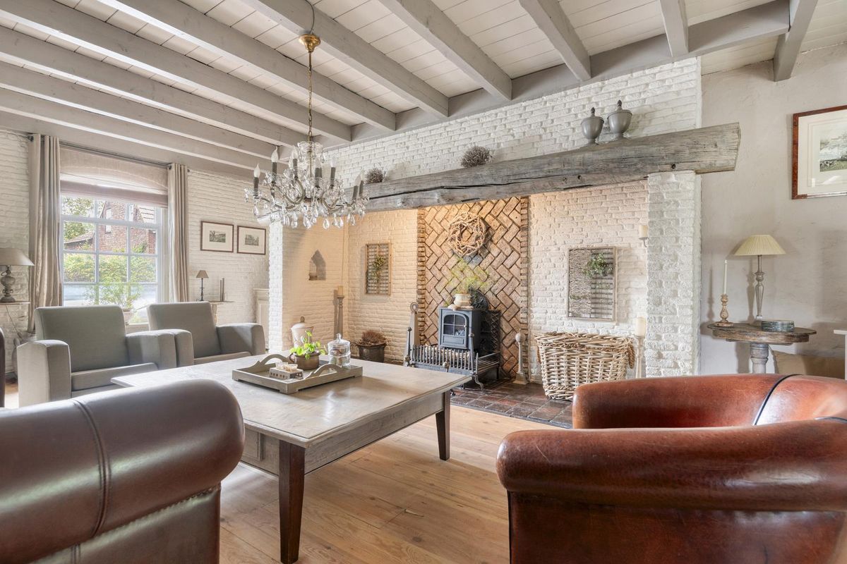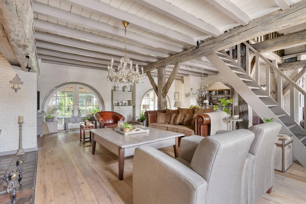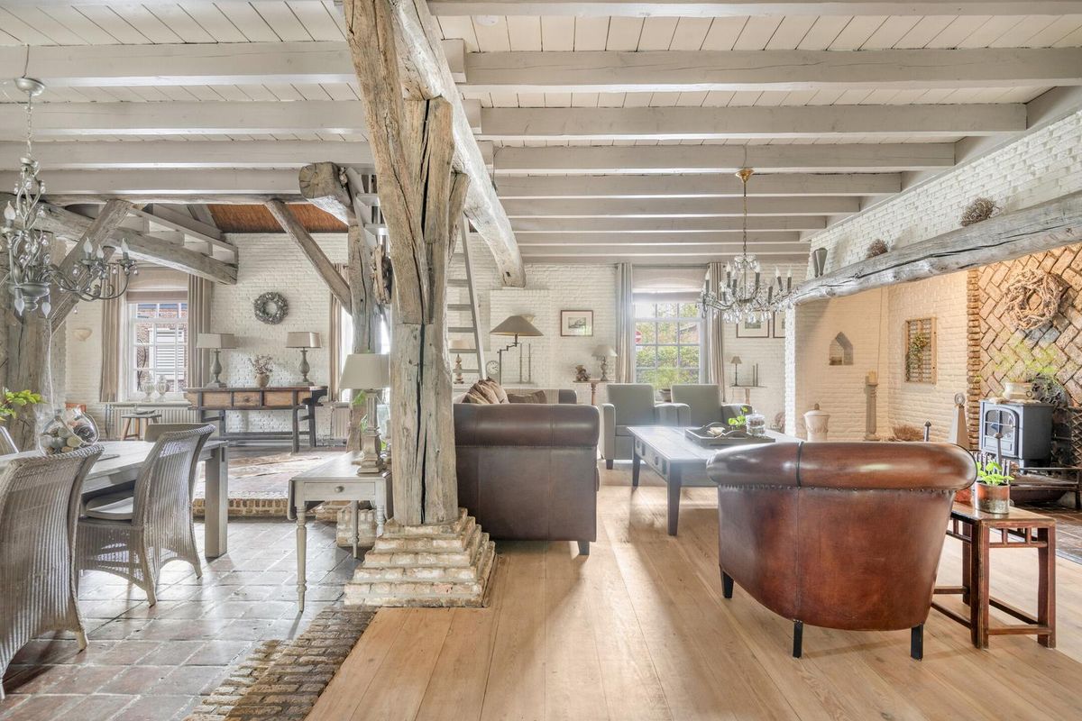 Vanuit de hal kom je in de ruime woonkamer met een oppervlak van ca. 80 m². De eikenbalken dragen hier ook zeker bij aan de gezelligheid van de woonkamer. Naast een antieke tegels zijn delen van de vloer voorzien van eikenhoutenplanken. Ook het niveauverschil deelt de grote woonkamer op in verschillende zitjes. De schouw is een eyecatcher in deze ruimte. Een heerlijke plek om samen rond het openvuur of houtkachel te zitten. In de woonkamer is de vaste trap naar de vide op de 1e verdieping.