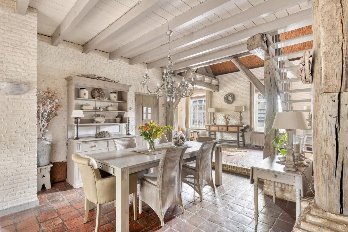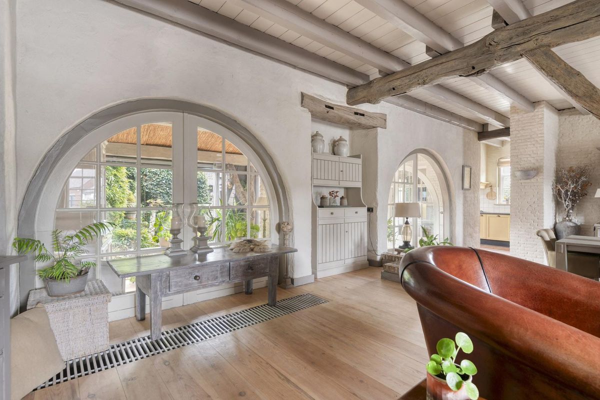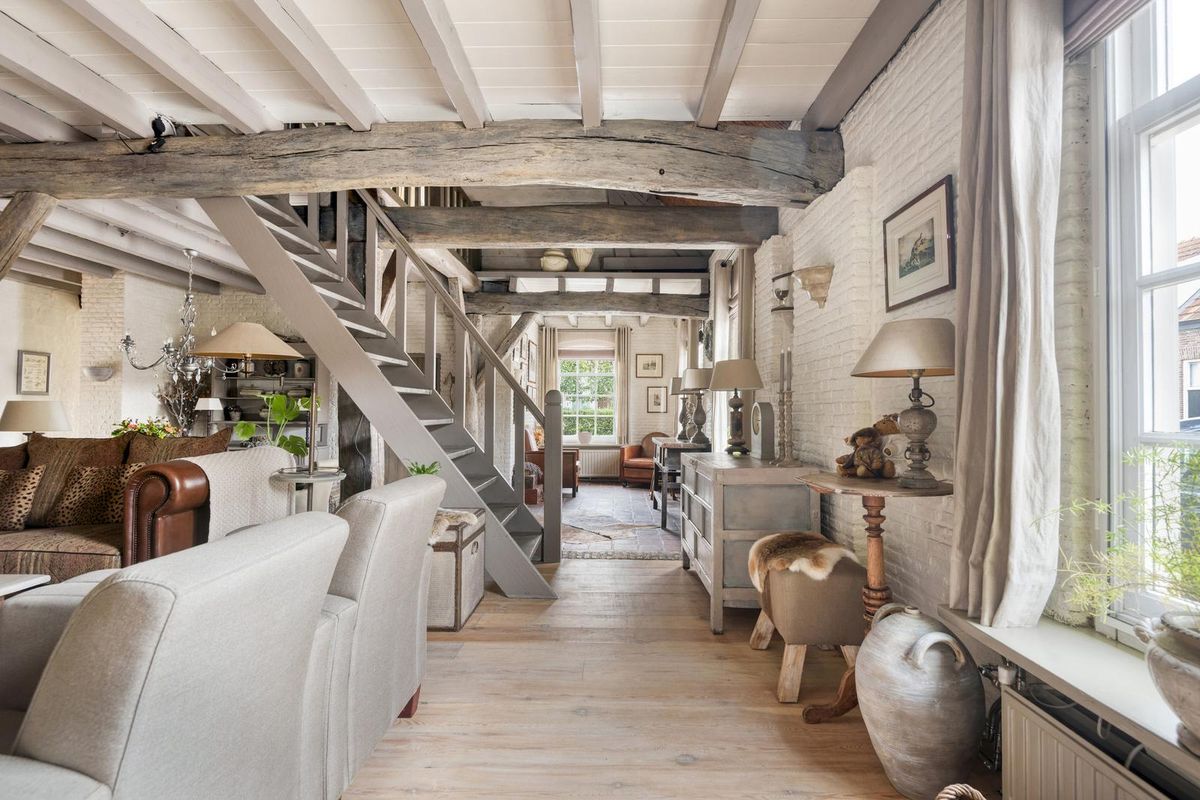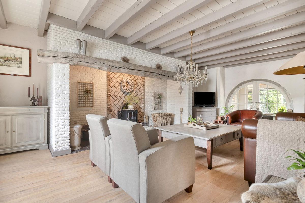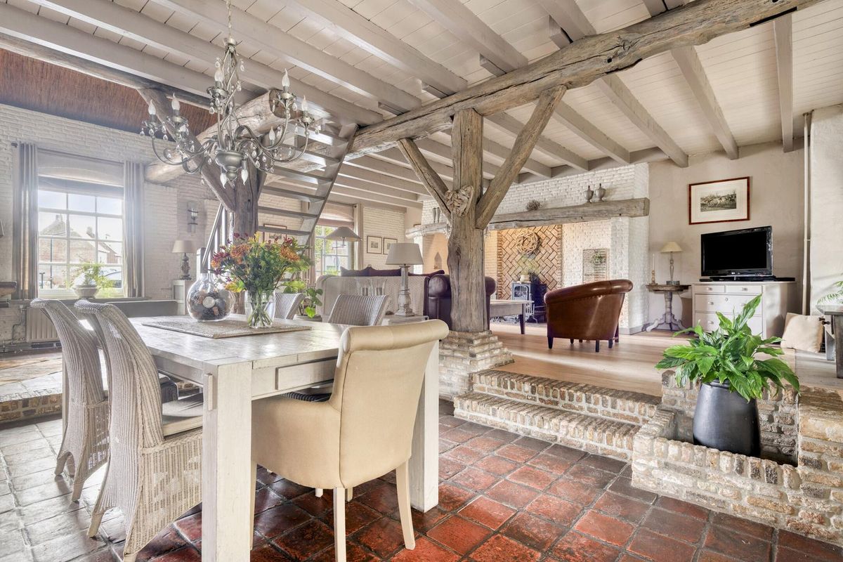 Vanuit de hal kom je in de ruime woonkamer met een oppervlak van ca. 80 m². De eikenbalken dragen hier ook zeker bij aan de gezelligheid van de woonkamer. Naast een antieke tegels zijn delen van de vloer voorzien van eikenhoutenplanken. Ook het niveauverschil deelt de grote woonkamer op in verschillende zitjes. De schouw is een eyecatcher in deze ruimte. Een heerlijke plek om samen rond het openvuur of houtkachel te zitten. In de woonkamer is de vaste trap naar de vide op de 1e verdieping.