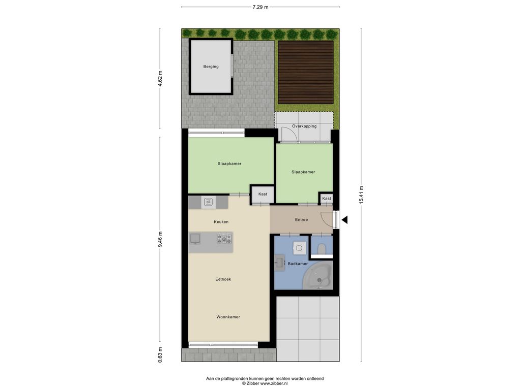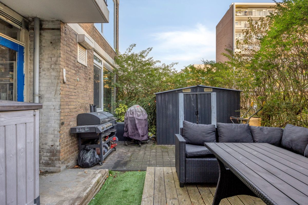 De achtertuin is een mooie buitenruimte met een praktische berging, achterom en voldoende plek voor een loungeset.
