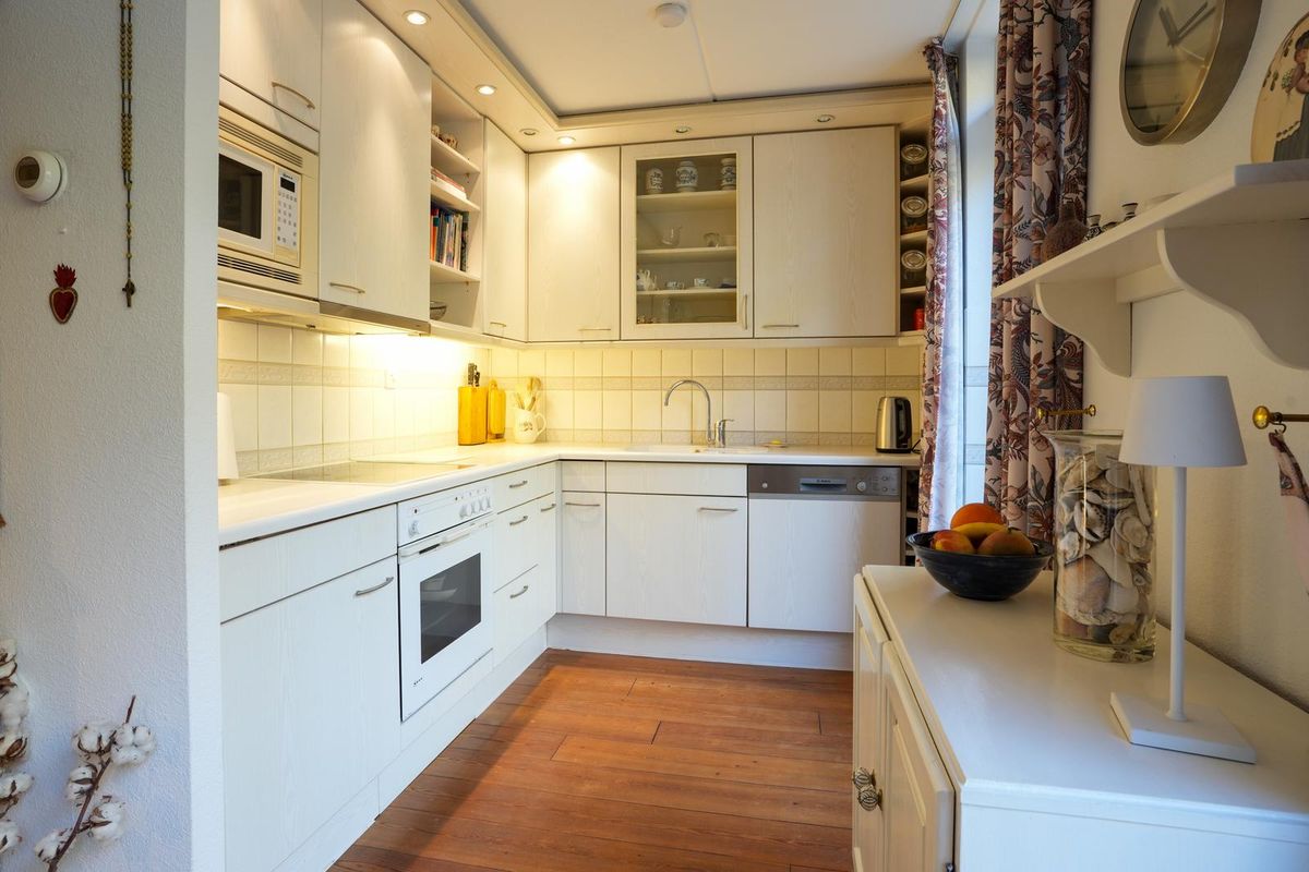 Half open keuken met enkele deur naar de tuin, aanbouwinstallatie voorzien van keramische kookplaat, oven, magnetron, koelkast en vaatwasser