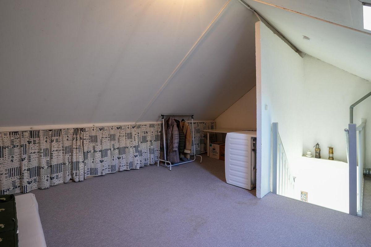 Via vaste trap bereikbare zolderverdieping, nu in gebruik als praktische ruimte maar eenvoudig om te bouwen tot slaapkamer. CV installatie, witgoedaansluiting en klein dakraam