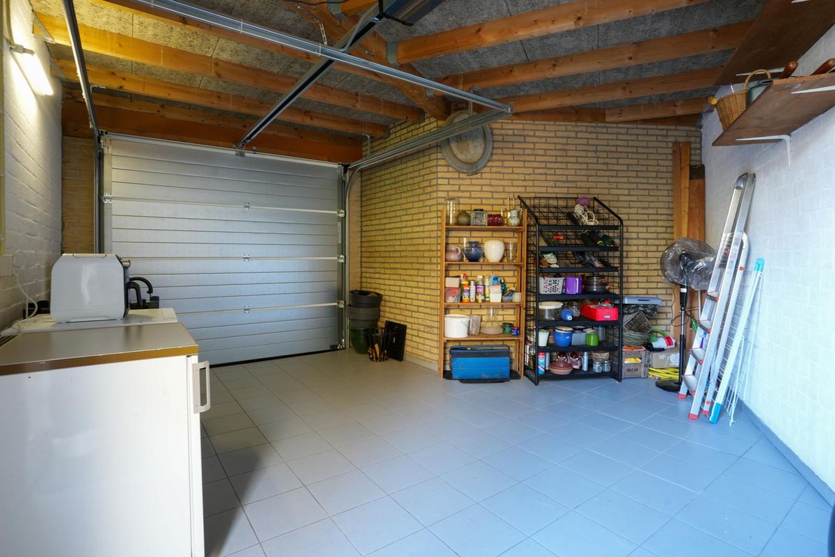 Garage voorzien van sectionale poort, enkele deur naar de tuin, betegelde vloer