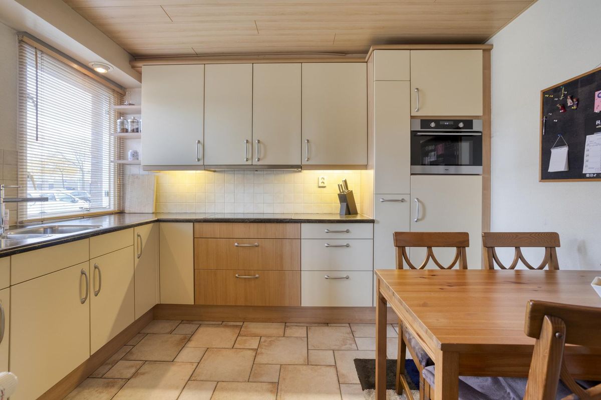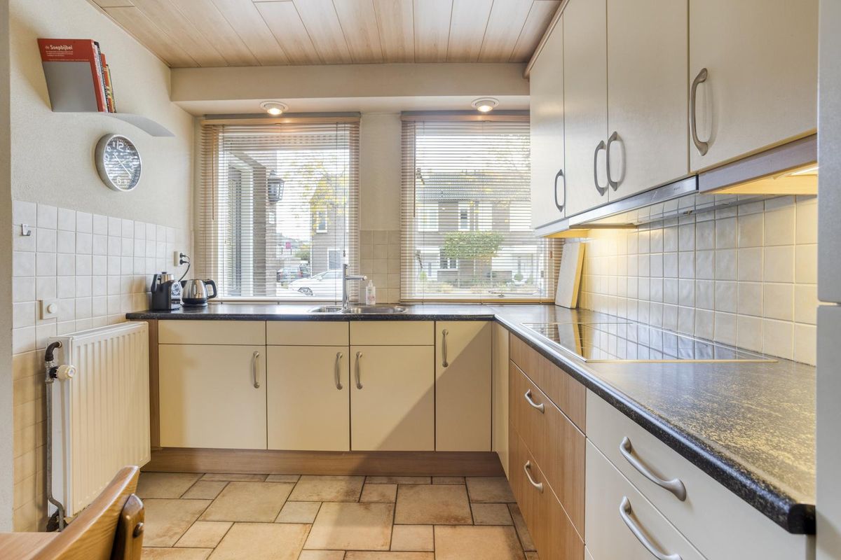Aan de voorzijde ligt de keuken, in een hoekopstelling. De inrichting is compleet met een keramische kookplaat, een afzuigkap, een combi-oven, een koelkast en een vriezer. Daarnaast is er voldoende bergruimte hier én in de provisiekast. Deze keuken biedt ruimte voor een eettafel waar je kunt gaan genieten van de lekkerste maaltijden.