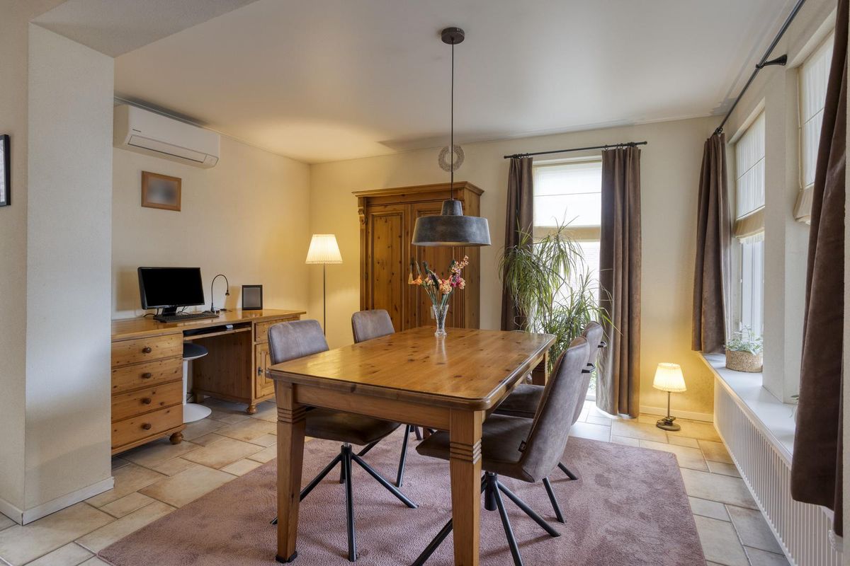 De tegelvloer, het spanplafond en de wanden met spachtelputz geven het geheel nu een klassieke uitstraling. Er hangt airco voor de warme dagen, en via de tuindeur loop je zo naar buiten.