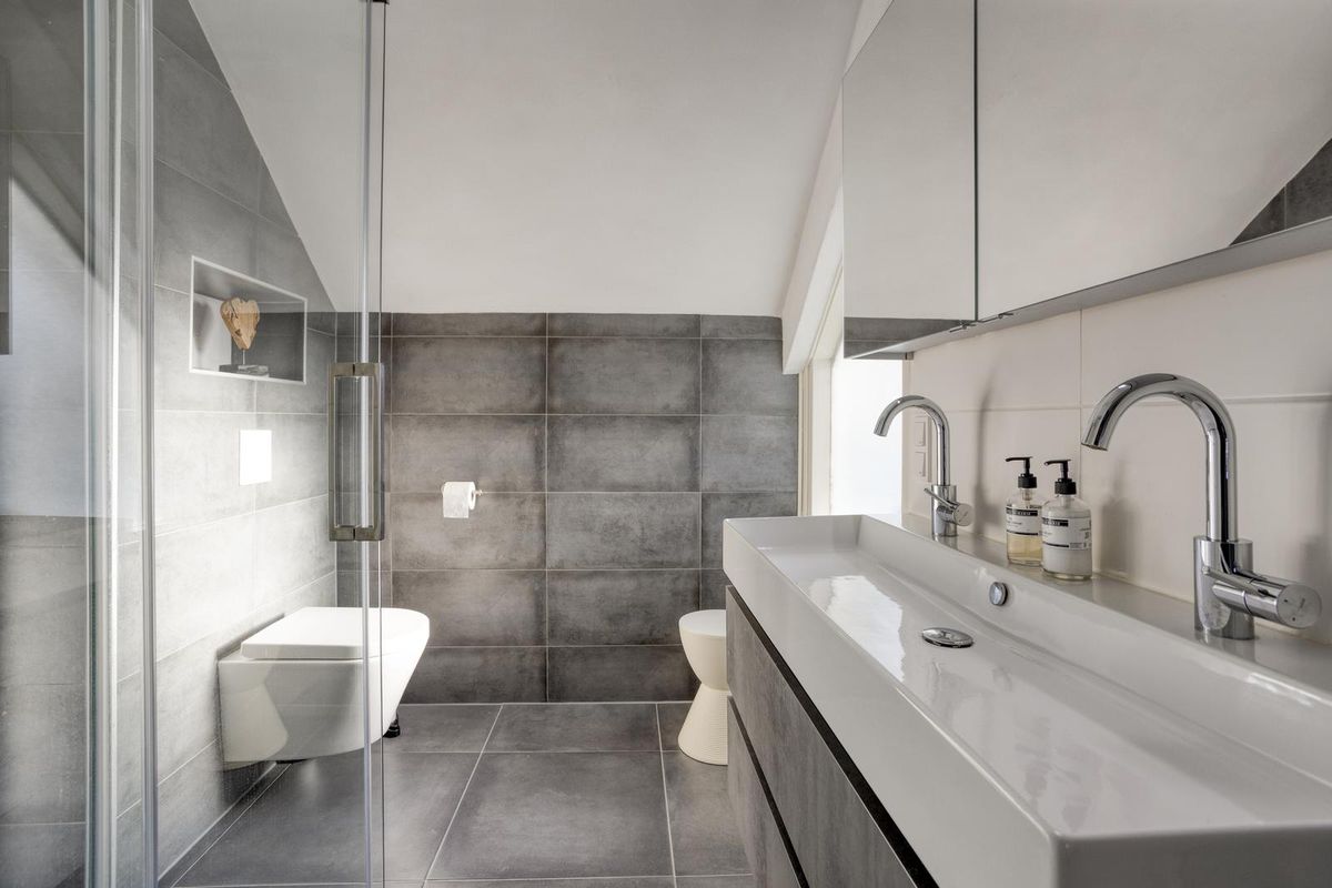 De badkamer is in 2020 volledig vernieuwd en dat verschil voel je direct. Modern en comfortabel, met een ruime inloopdouche, dubbele wastafel, spiegelkast, elektrische vloerverwarming en daglicht via een driehoekig raam. Hier hoef je niets meer aan te doen behalve gewoon genieten.