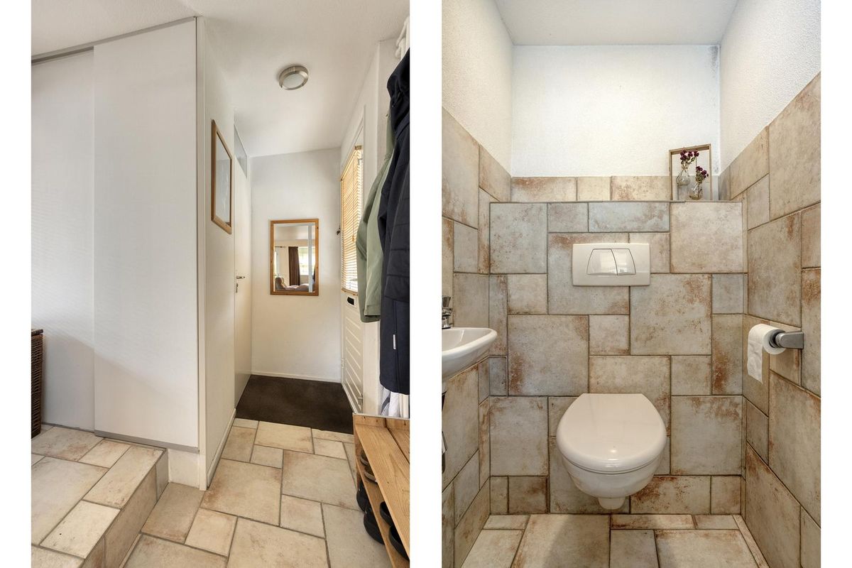 Via de hal met toiletruimte, meterkast en speels niveauverschil naar boven, stap je door naar het hart van de woning.